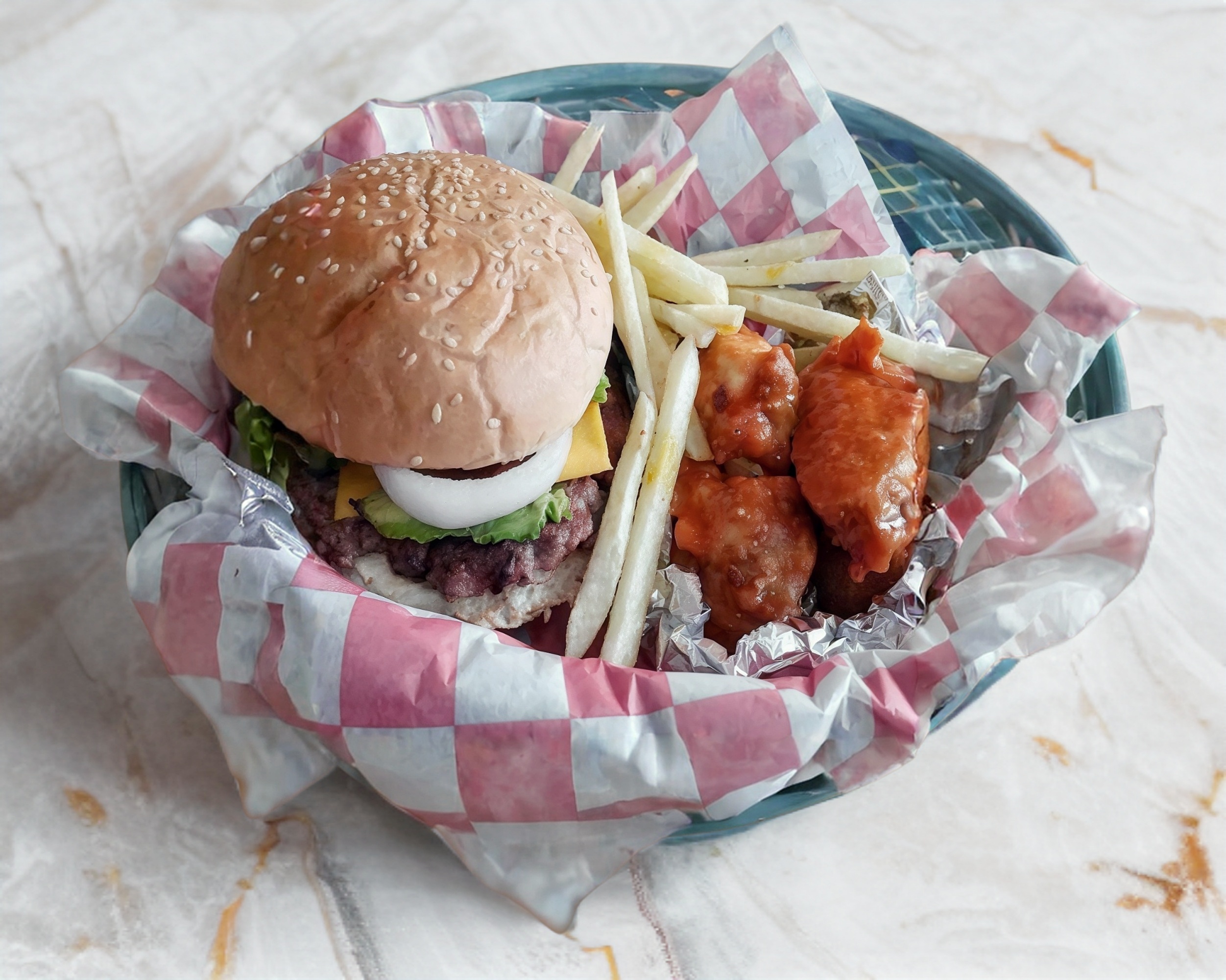 1 hamburguesa clásica con papas a la francesa, 150GR de boneless, 2 poppers, 1 aros de cebolla y 2 dedos de queso.