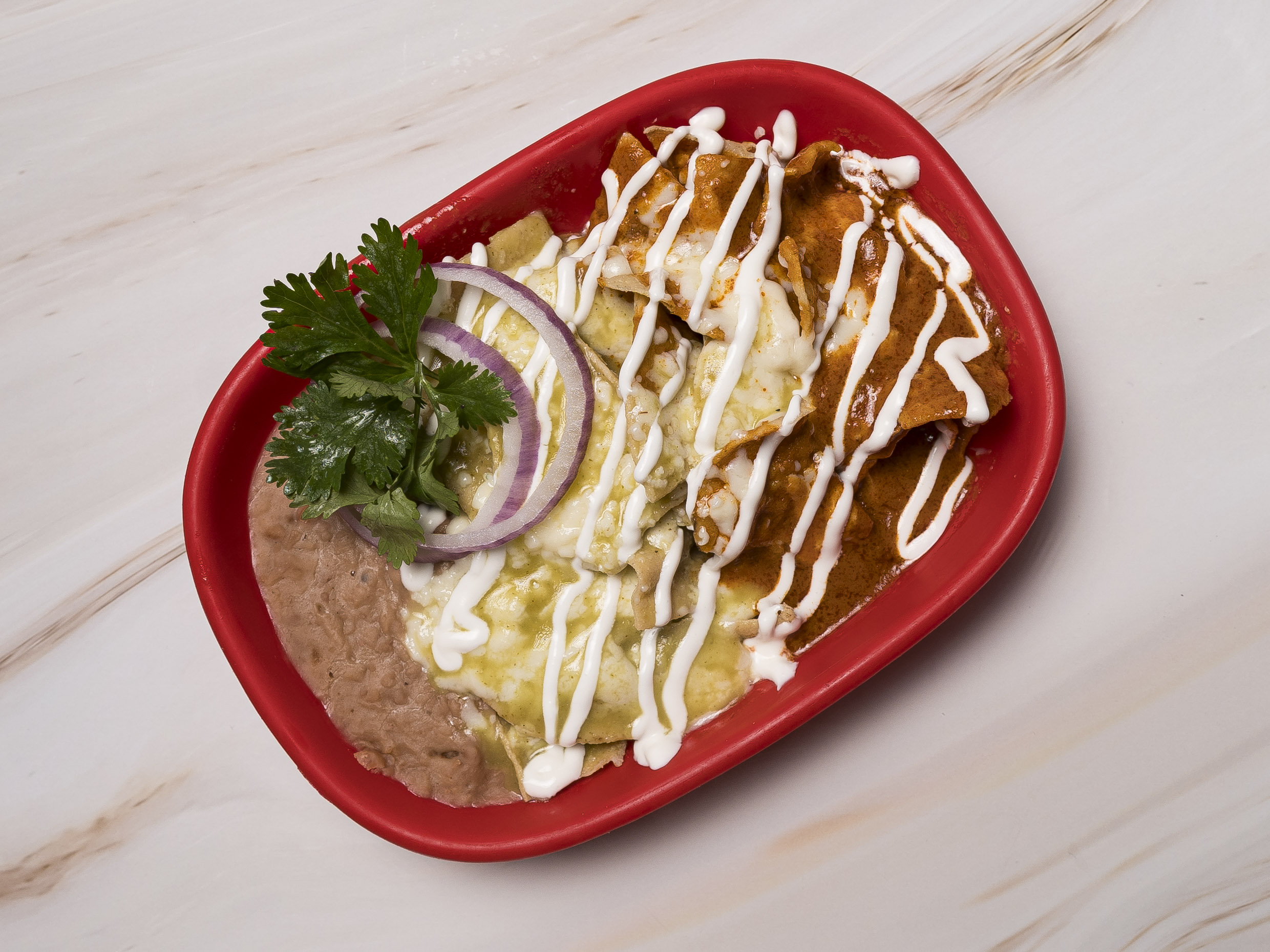 Totopos ( porción individual) bañados en salsa con queso asadero, crema, cebolla morada y cilantro, acompañados de frijoles refritos.