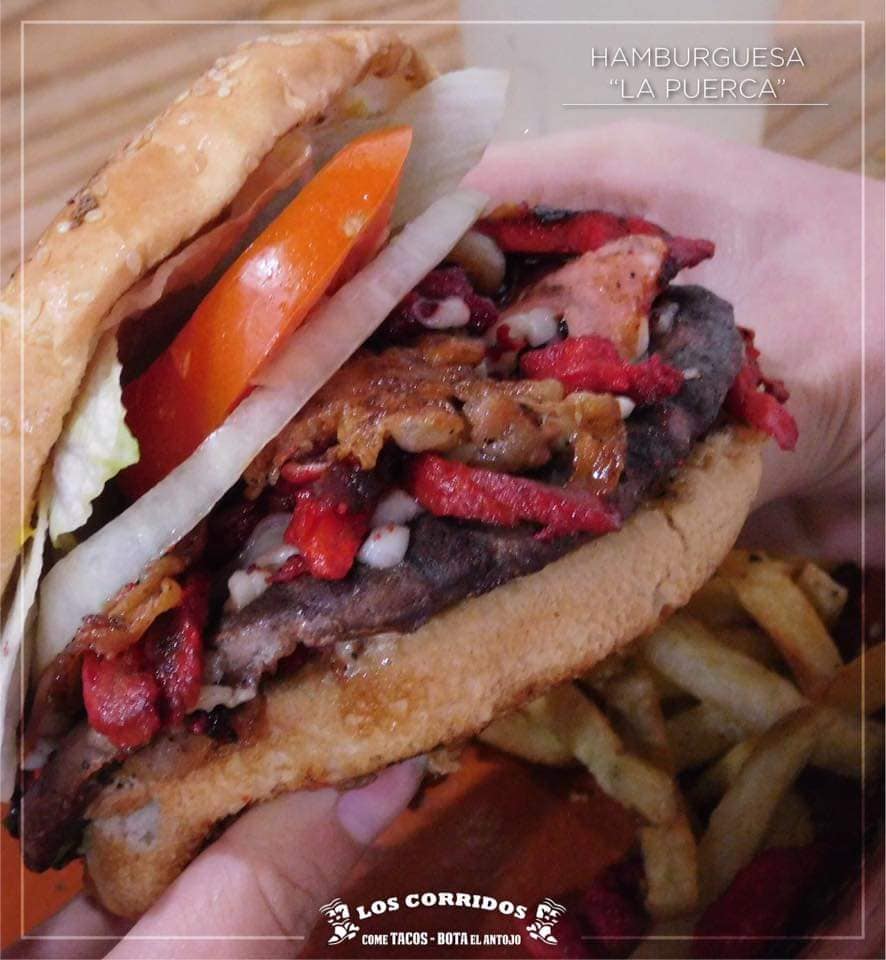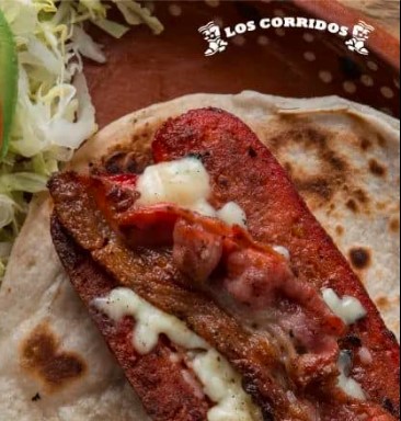 Salchicha asada tortilla de harina tocino queso lechuga aguacate.