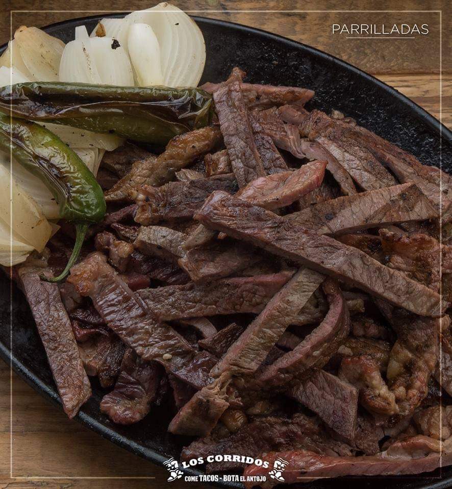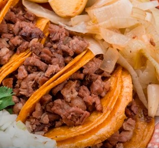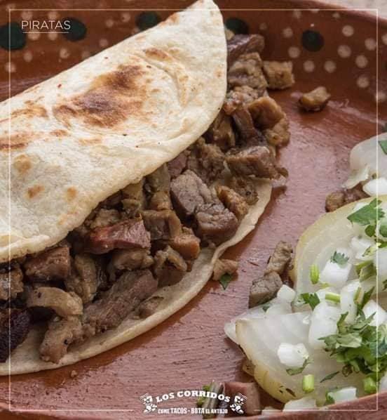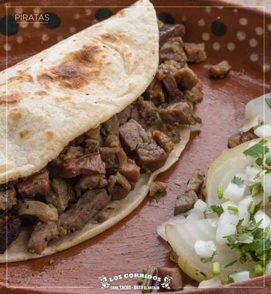 2 ordenes de piratitas, tacos de carne asada en tortilla de harina y queso, cebolla asada