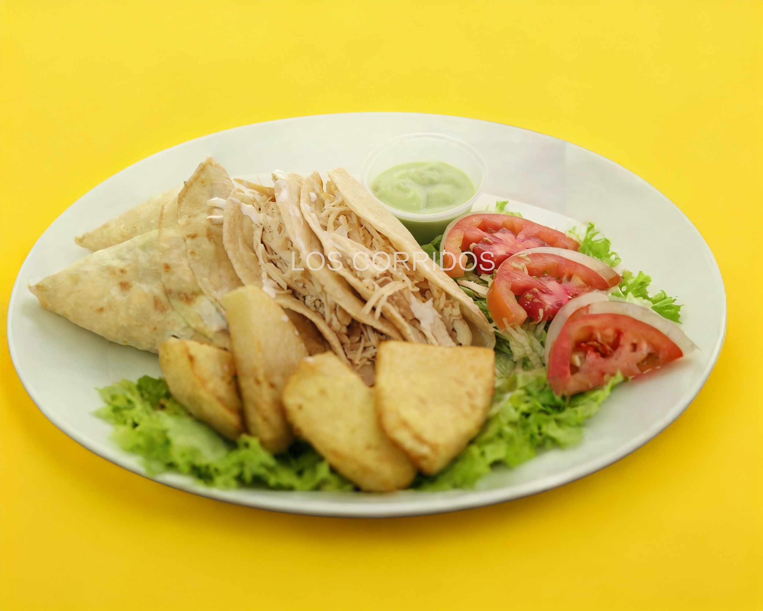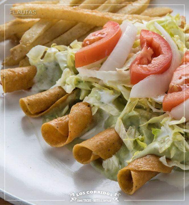2 ordenes de flautas acompañadas con papas a la francesa, ensalada de lechuga, guacamole y crema