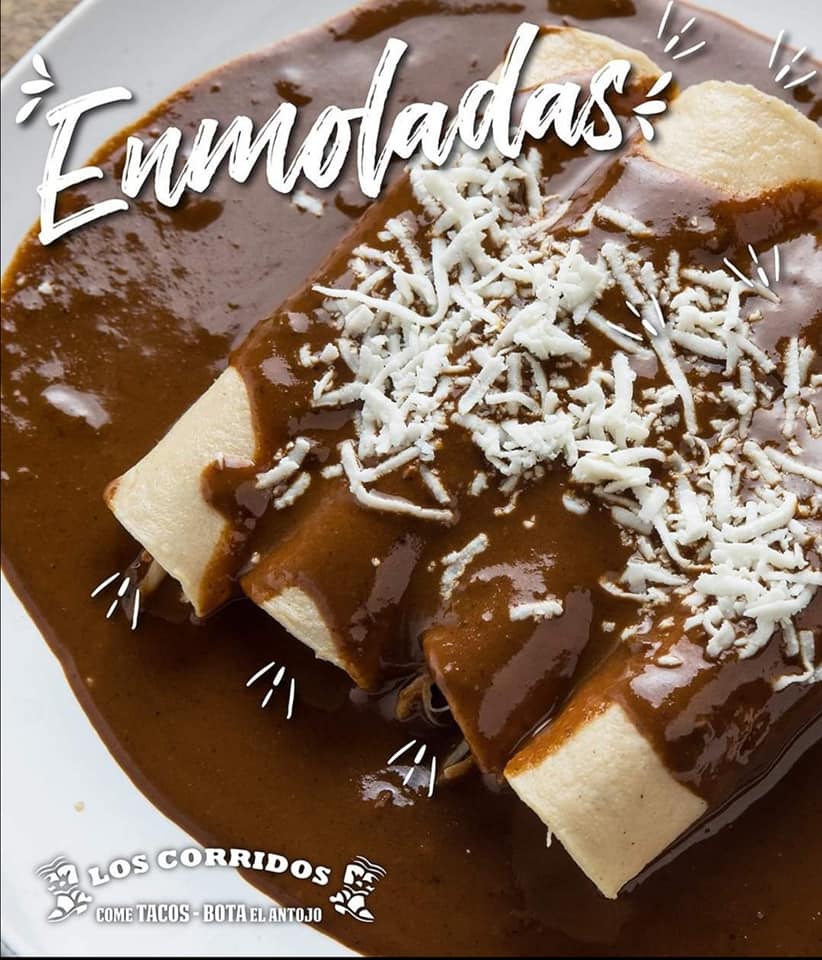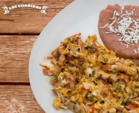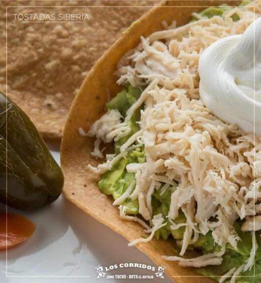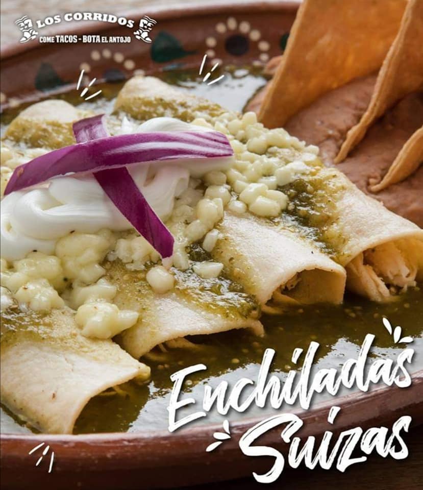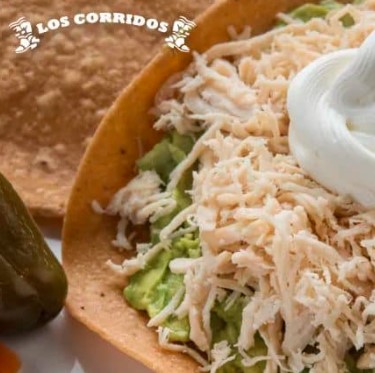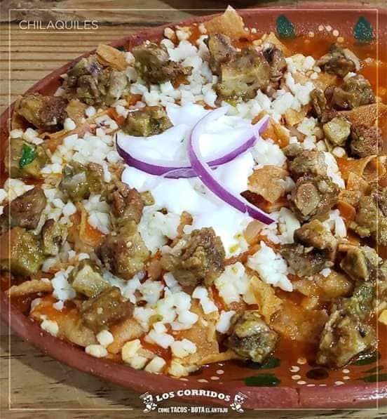 Ya sean verdes o rojos por encima con queso asadero crema ácida y cebolla morada además de una porción de pechuga de pollo desmenuzada y por un lado frijolitos refritos.