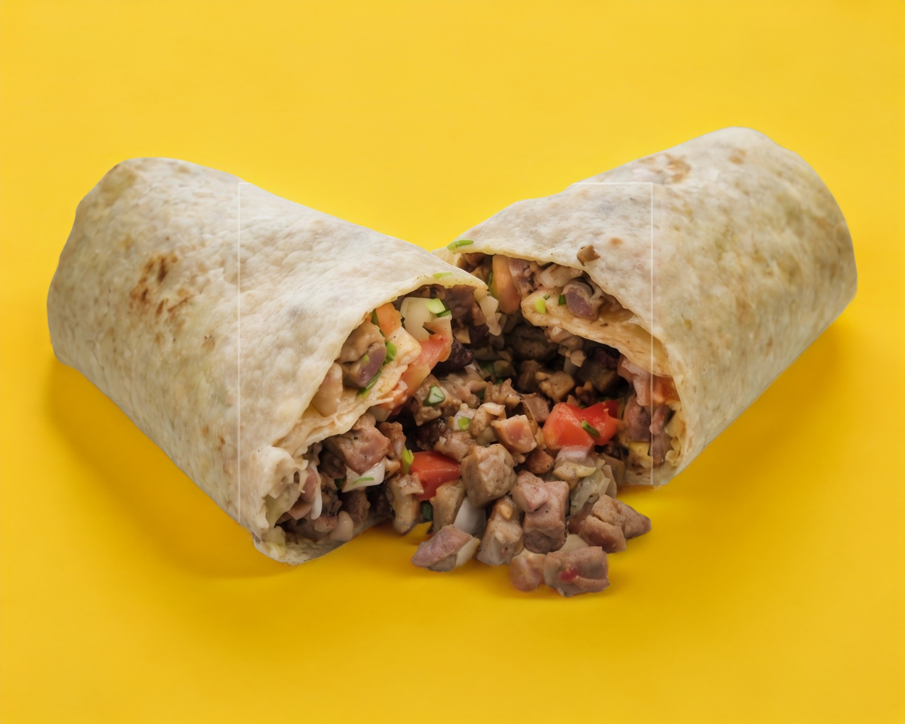 Burrito gigante incluye carne de asada, lleva una tortilla grande, acompañada con cebolla,tomate,cilantro,queso (porcion personal)