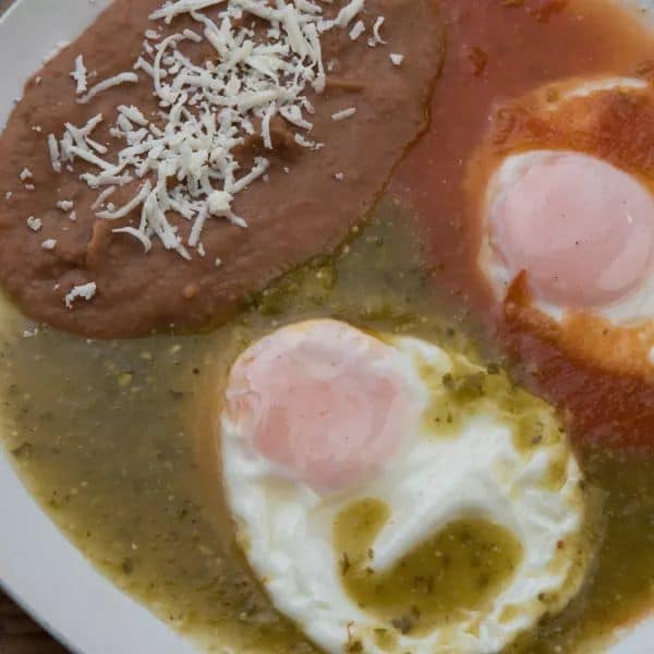 Deliciosa salsa casera verde o roja acompañados de frijoles refritos.