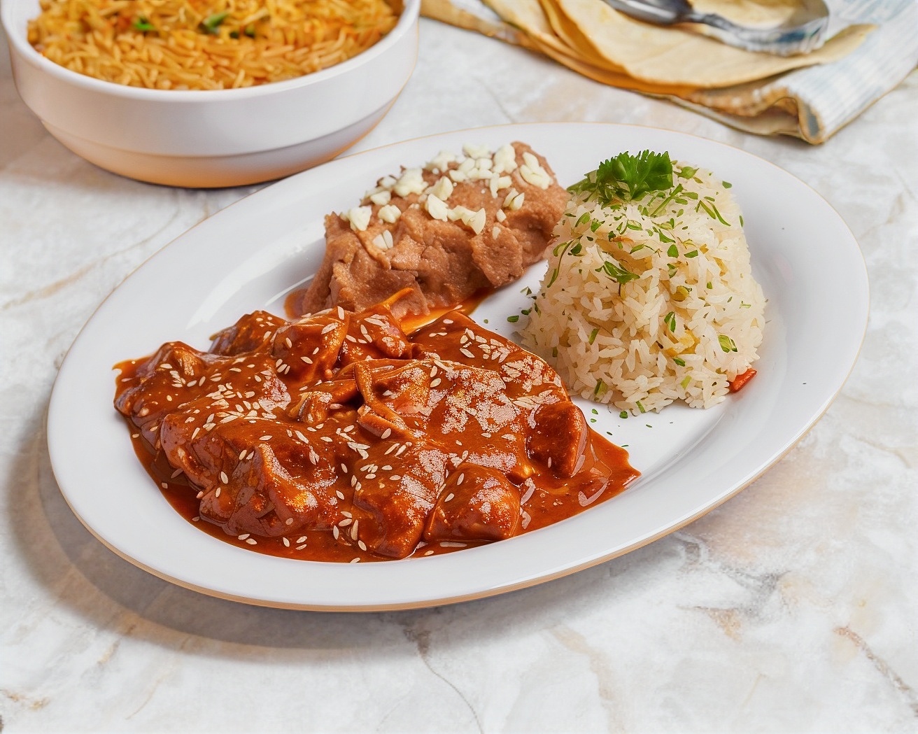 Pechuga de pollo bañada en mole poblano con su toque de ajonjolí