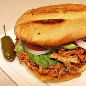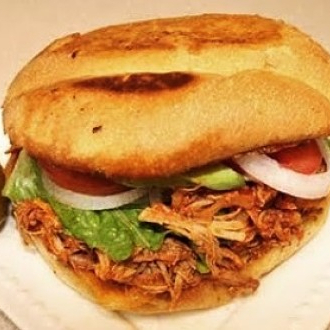 TORTA DE PIERNA ADOBADA EN CHIPOTLE PAN TELERA DEL DIA JAMON QUESO AGUACATE ADEREZO Y CREMA