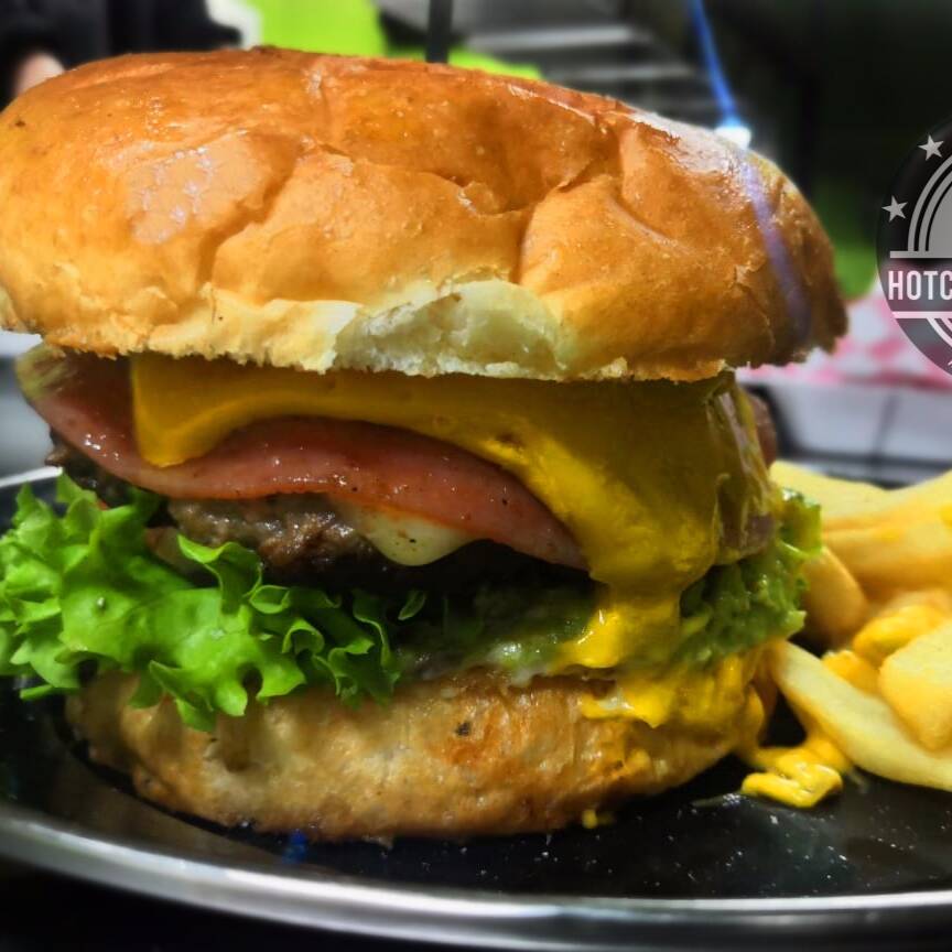Pan artesanal, 200 grms de carne de res, 2 hojas de tocino dorado, 2 aros de cebolla freídos, queso manchego, y queso cheddar, aderezos, verduras.