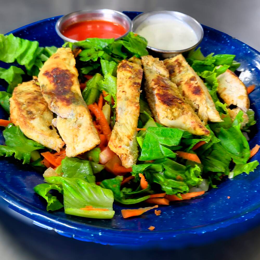 250 gramos de Pechuga de pollo dorada a la plancha, con ensalada de lechuga italiana, con aderezo Ranch y búfalo.