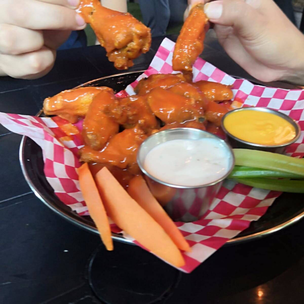 1 kg de pechuga de pollo empanizada y freída, bañados a salsa de su elección, bastones de apio, bastones de zanahoria y aderezo Ranch.