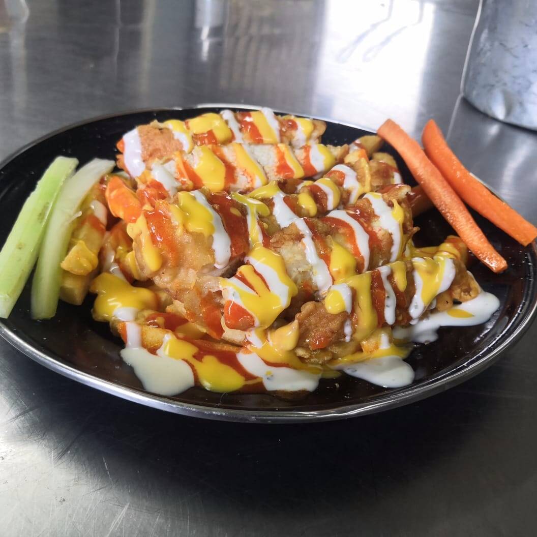 Tiras de pollo en una cama de papas, bañada en Ranch, Búfalo, y queso cheddar.