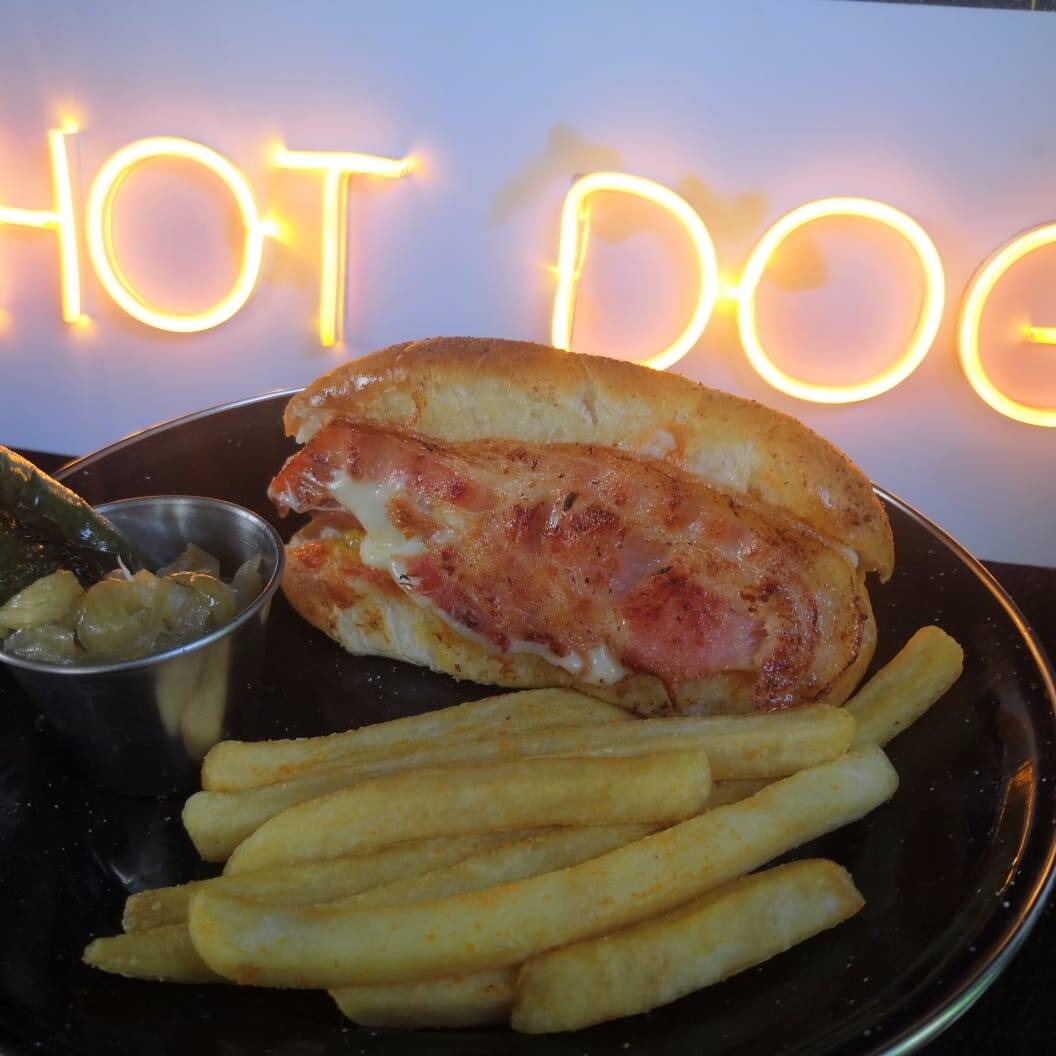 Pan artesanal con salchicha de pavo, mayonesa casera, queso mozzarella y dos hojas de tocino natural.