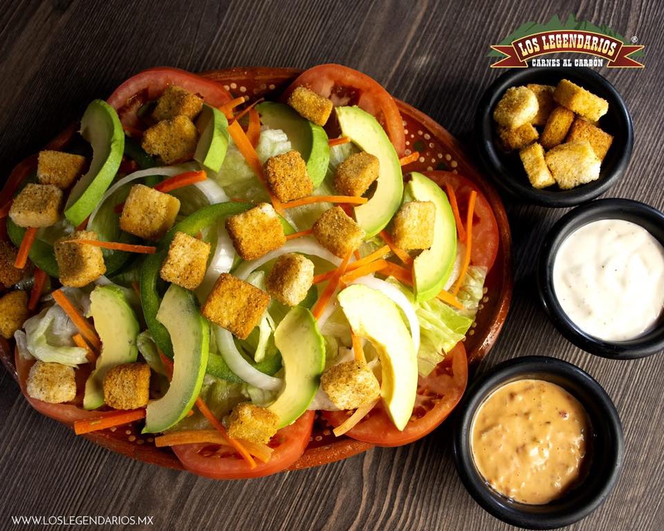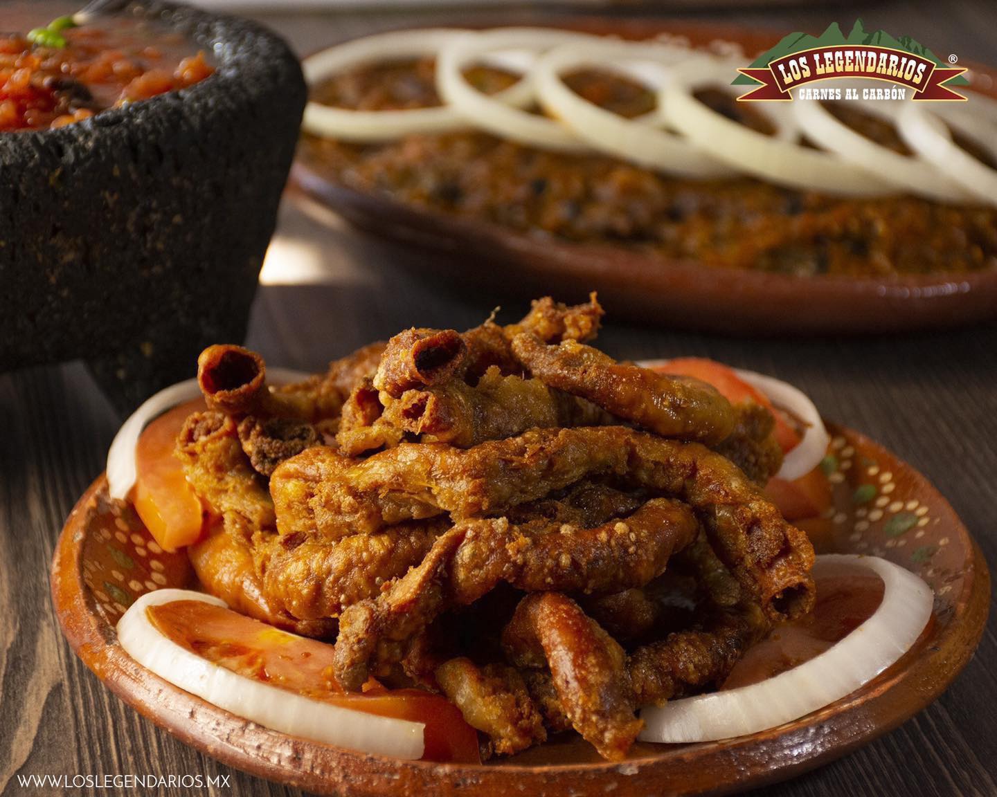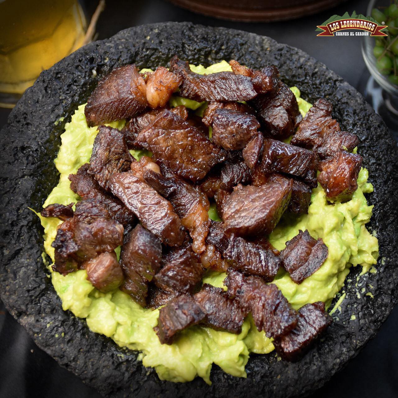 300 gr de rib-eye en chicharrón sobre un guacamole al piquín, en molcajete.