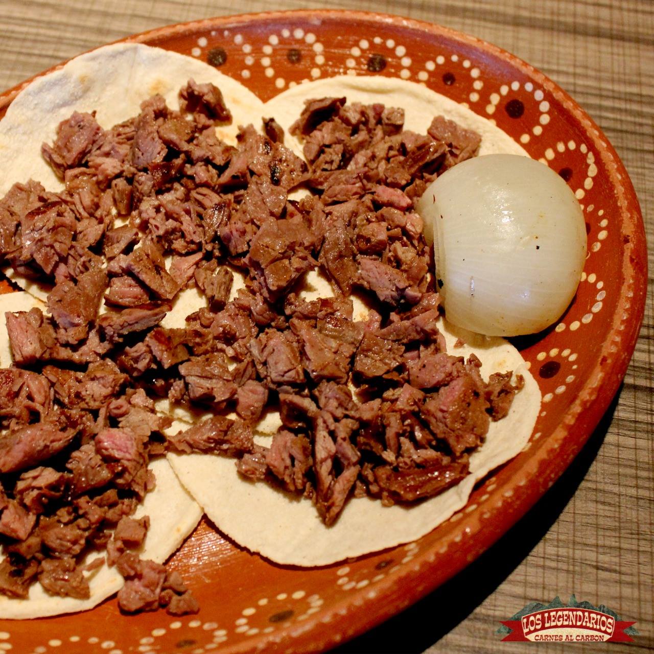 1/2 Kg de carne, 2 frijoles a la charra, 1 cebolla asada y tortillas.