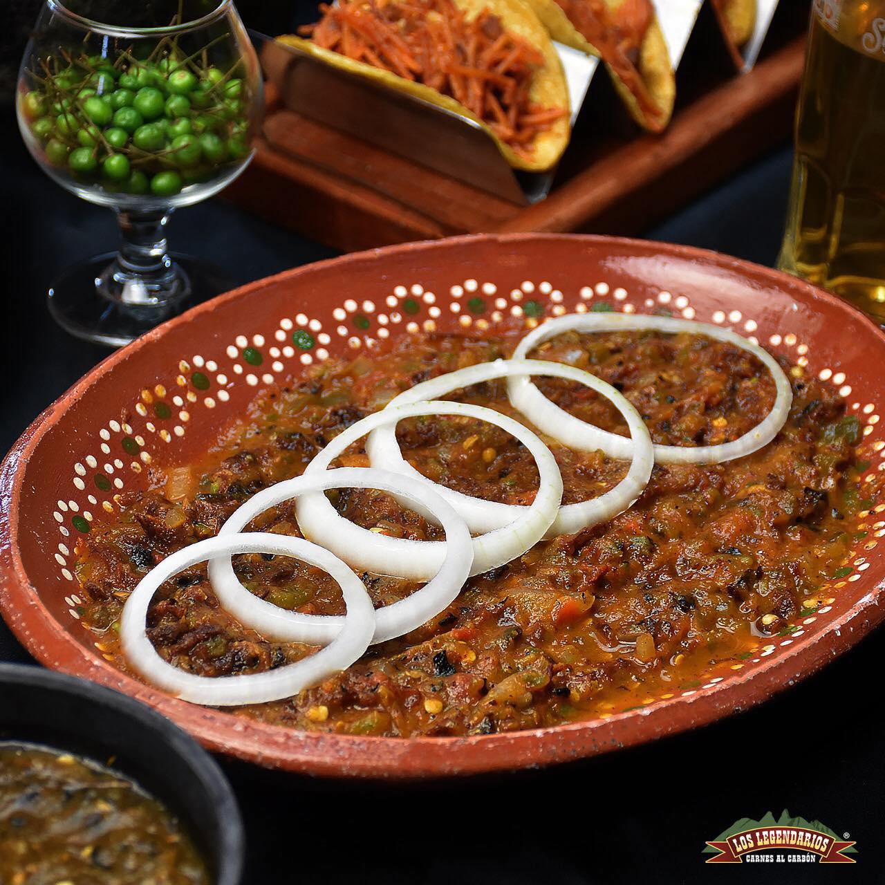 300 gr de carne, frijoles charros, cebolla asada y tortillas.