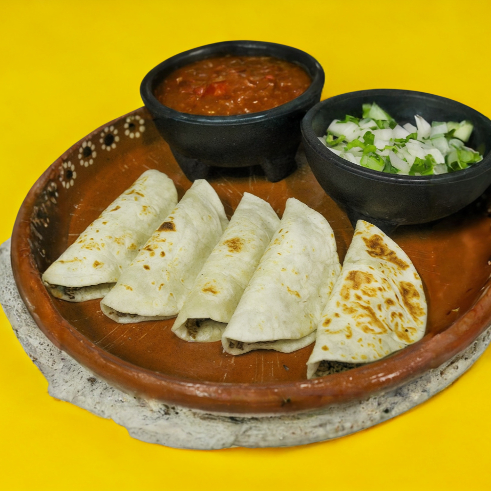 Tortilla de harina de 30 cm. con frijoles, carne, queso y aguacate + Salsas a eleccion