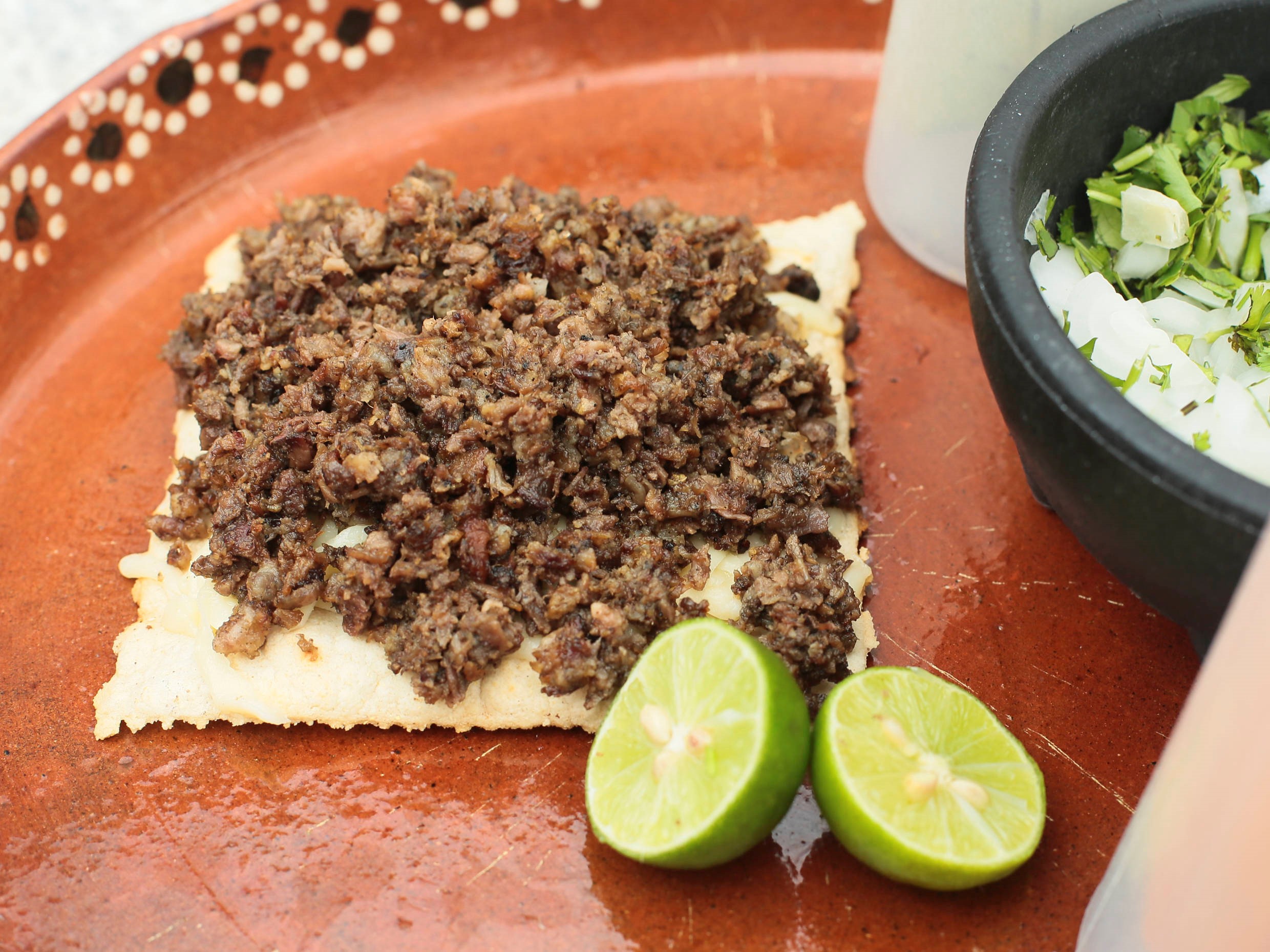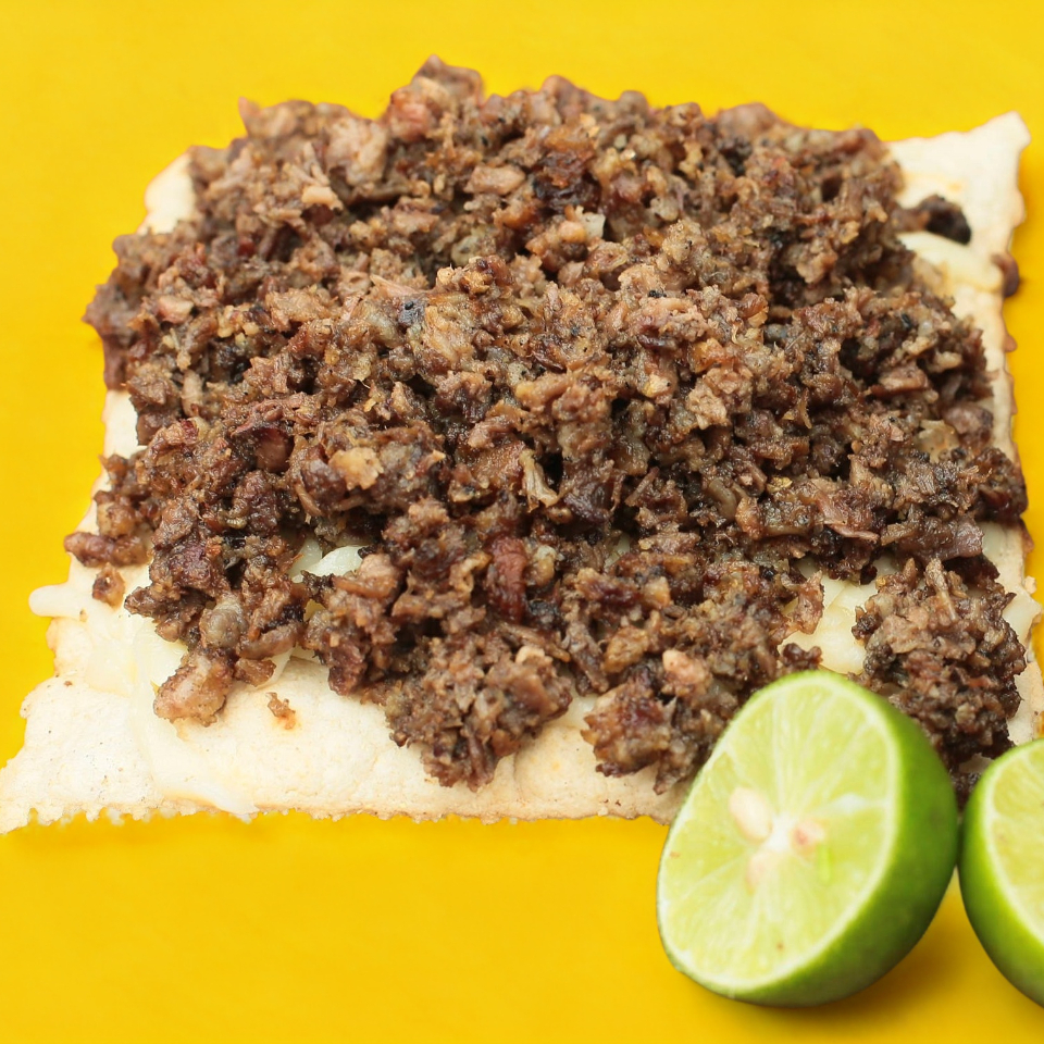 Tortilla cuadrada recién hecha, tostada con queso y carne.