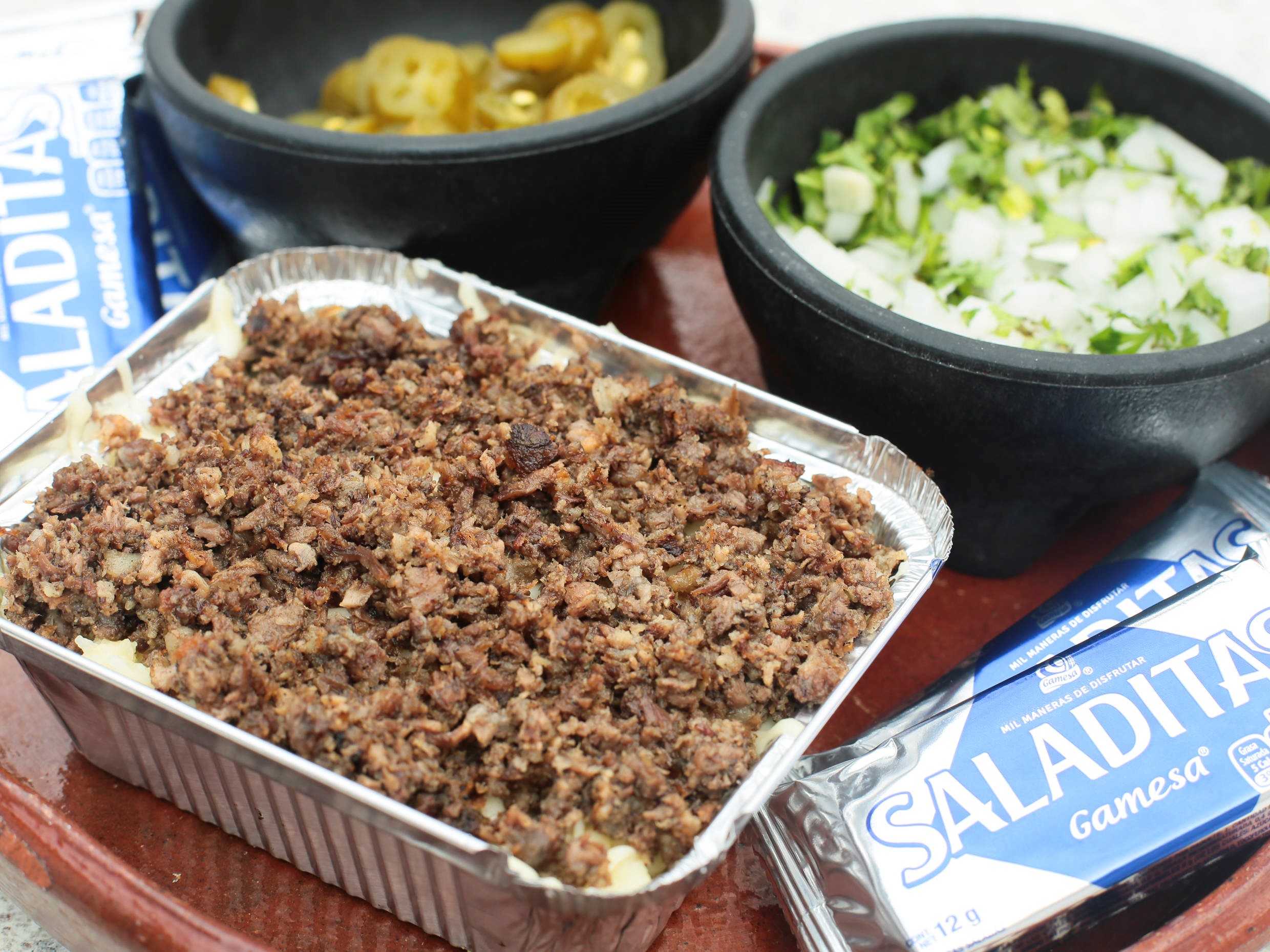 Tortilla ovalada (tipo huarache) recién hecha, tostada con frijoles, carne, queso y aguacate.