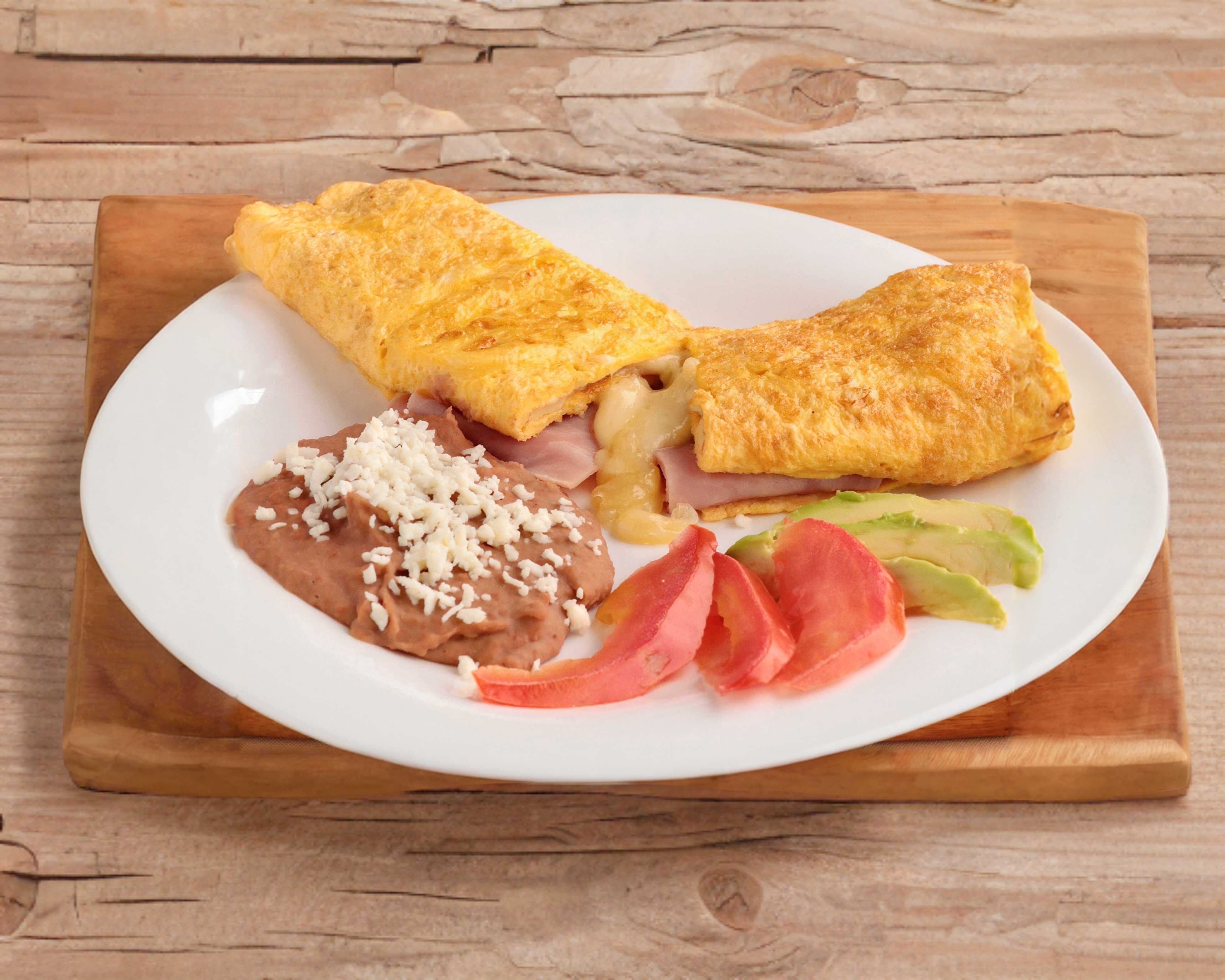 cama de huevo rellena de queso oaxaca y jamón acompañado de frijolitos, verduras, tortillas y salsa.
