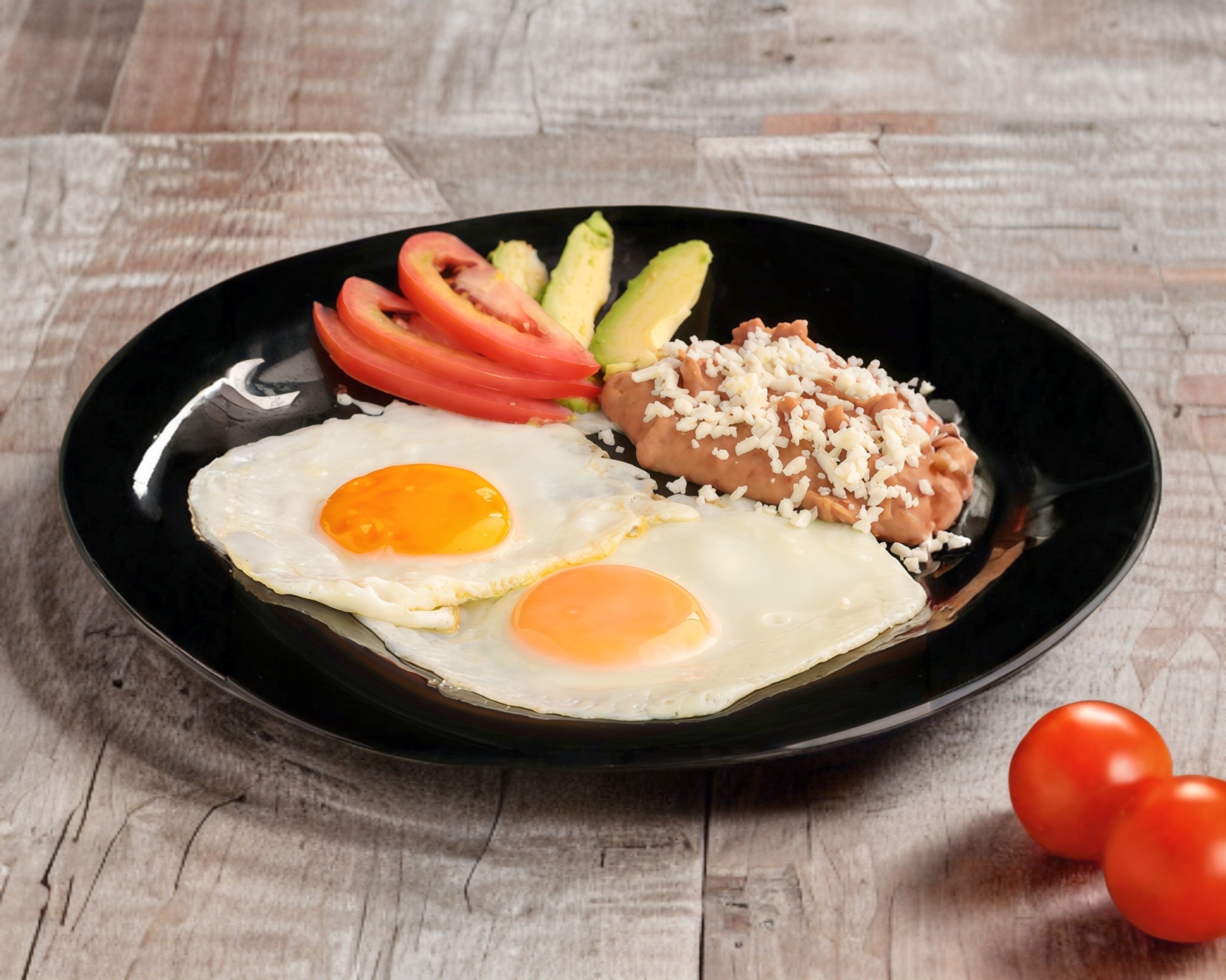 Tradicional huevito con papas acompañados de frijoles refritos y espolvoreamos quesito, tortillas y salsa.