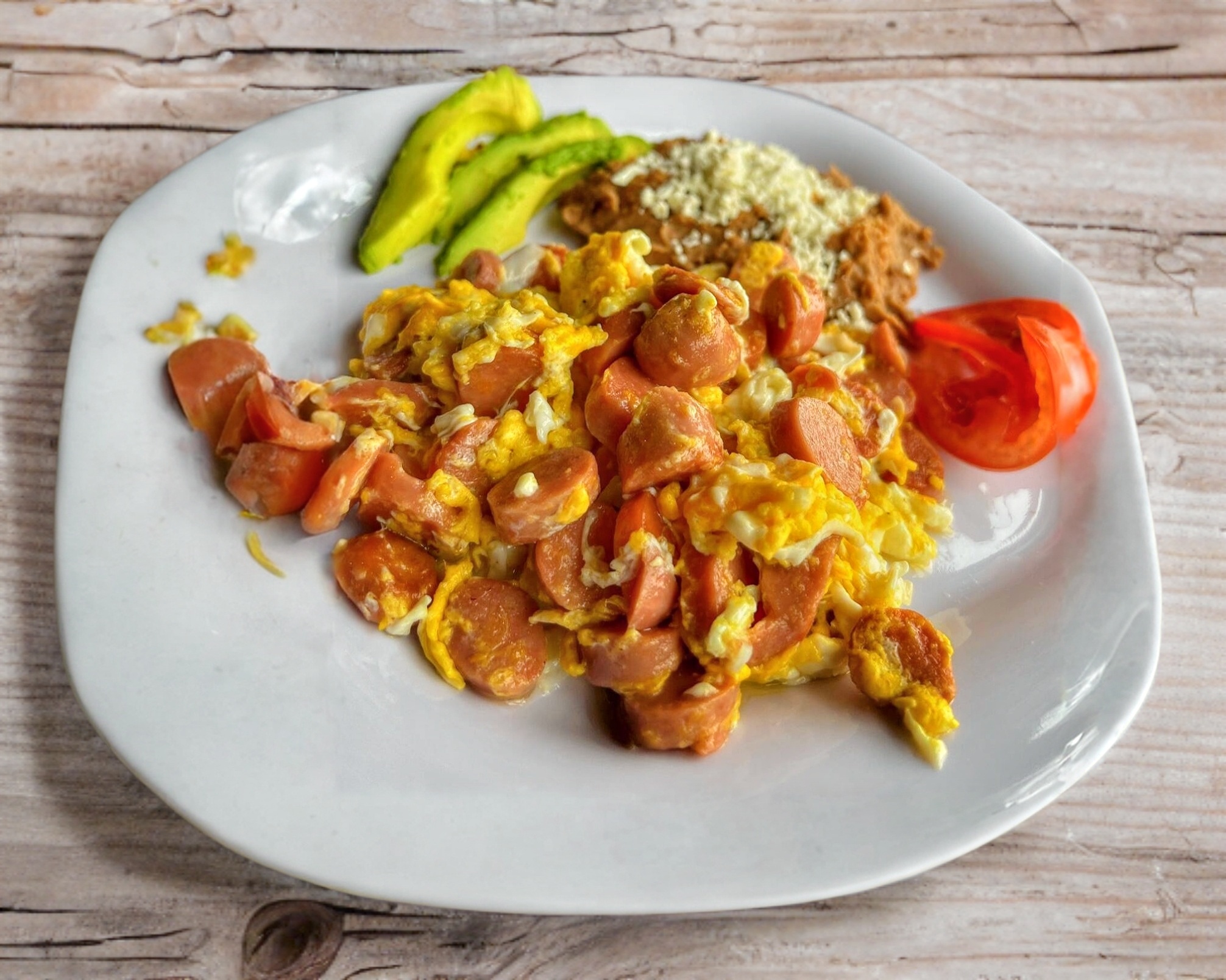 Huevo 2 piezas mezclado con salchicha 60 gramos, acompañado de frijolitos, verdura, tortillas y salsa.
