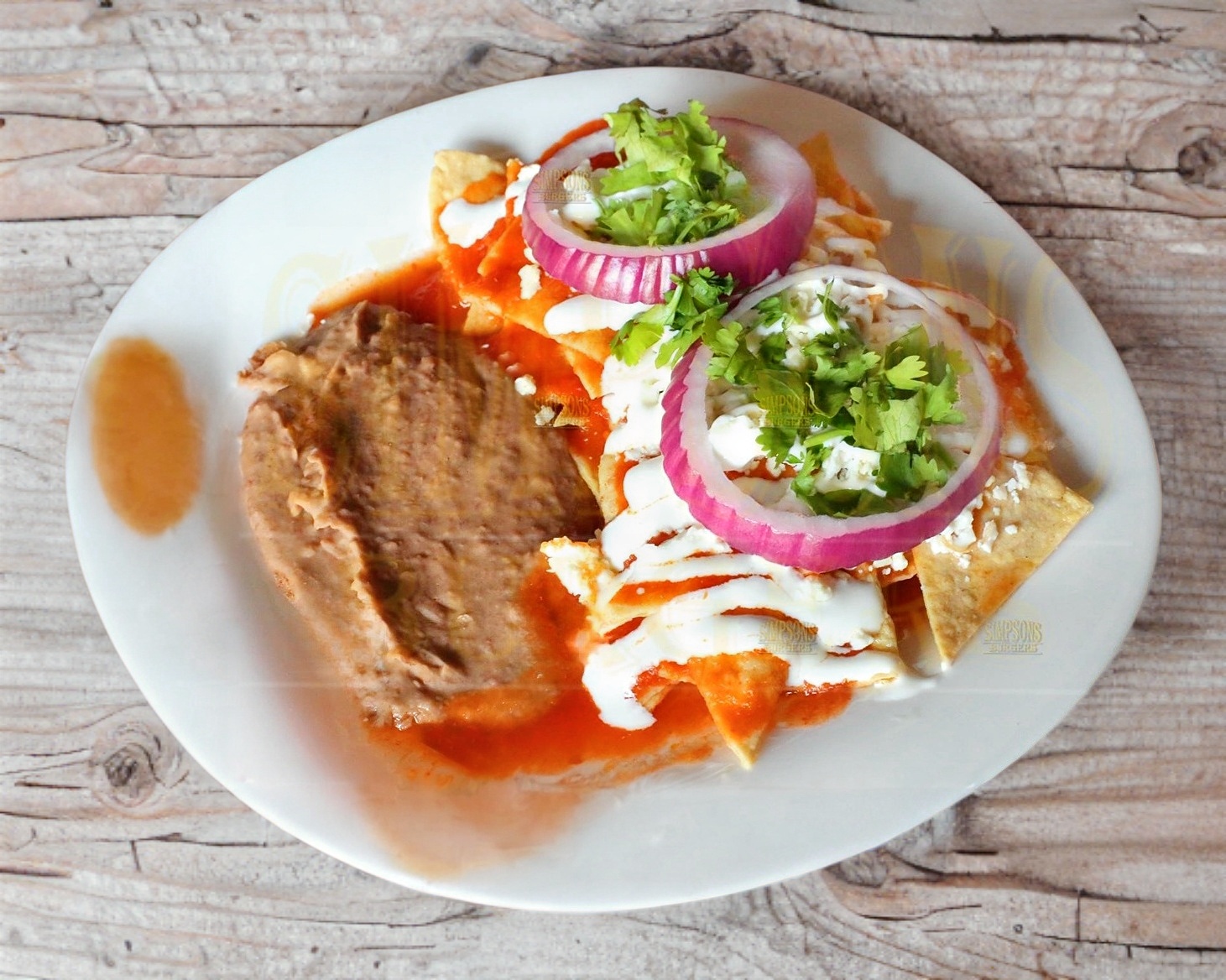 Deliciosos triángulos de tortillas tostaditos bañados en en salsa verde ó roja espolvoreados con quesito panela adornados de crema y un toque de cilantro y cebolla acompañados de frijolitos