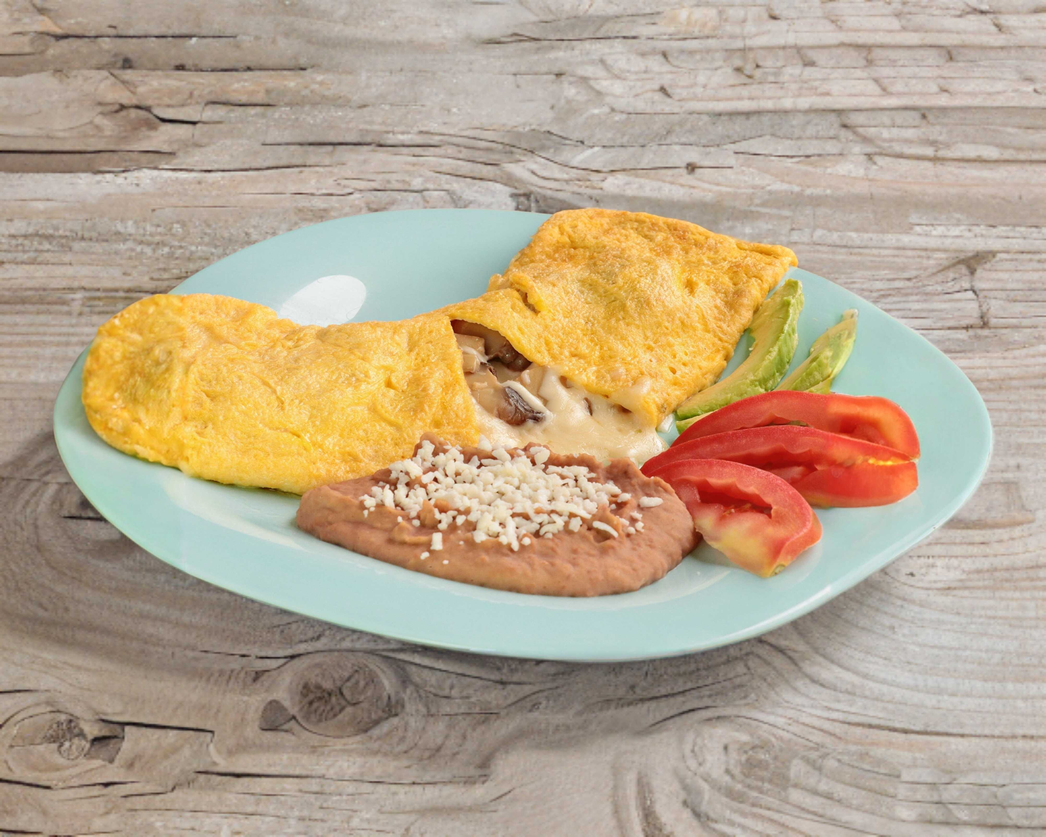 Cama de huevo rellena de queso oaxaca y frescos champiñones naturales acompañado de frijolitos, verdura, tortillas y salsa.