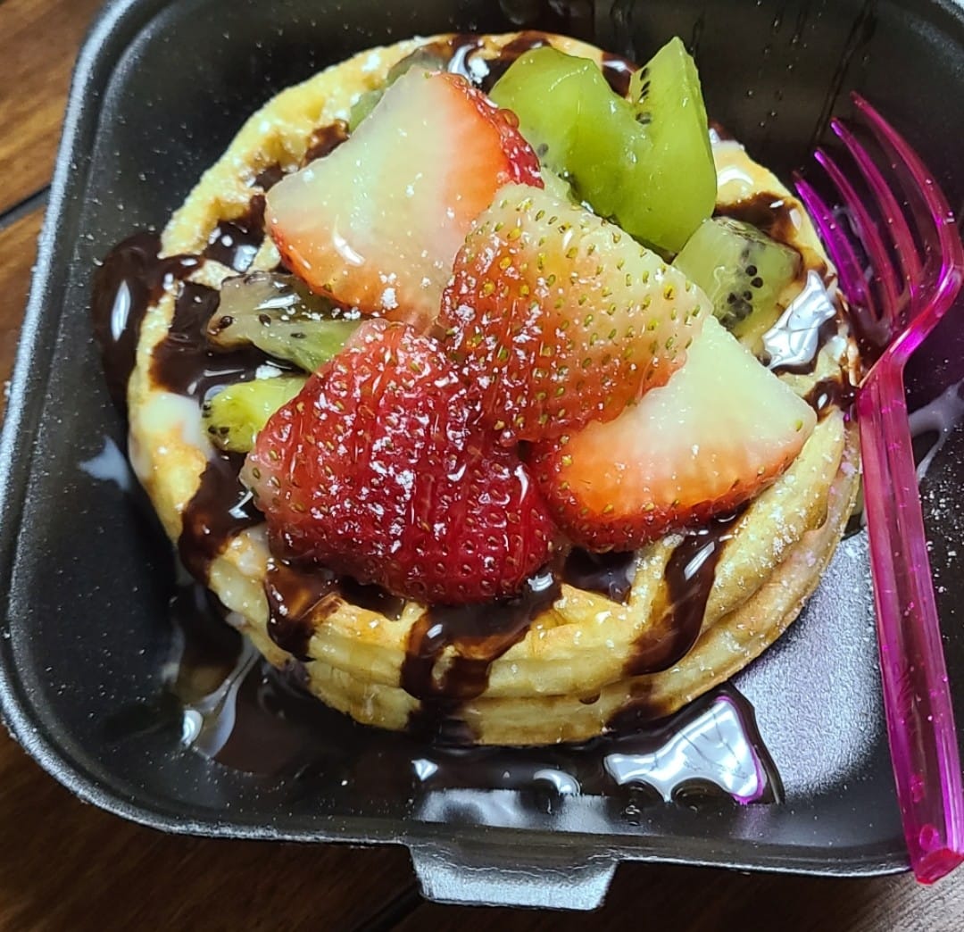 2 WAFFLES CON MORAS PREPARADOS 1 FRUTA A ELEGIR 2 JARABES A ELEGIR 1 TOPPING A ELEGIR