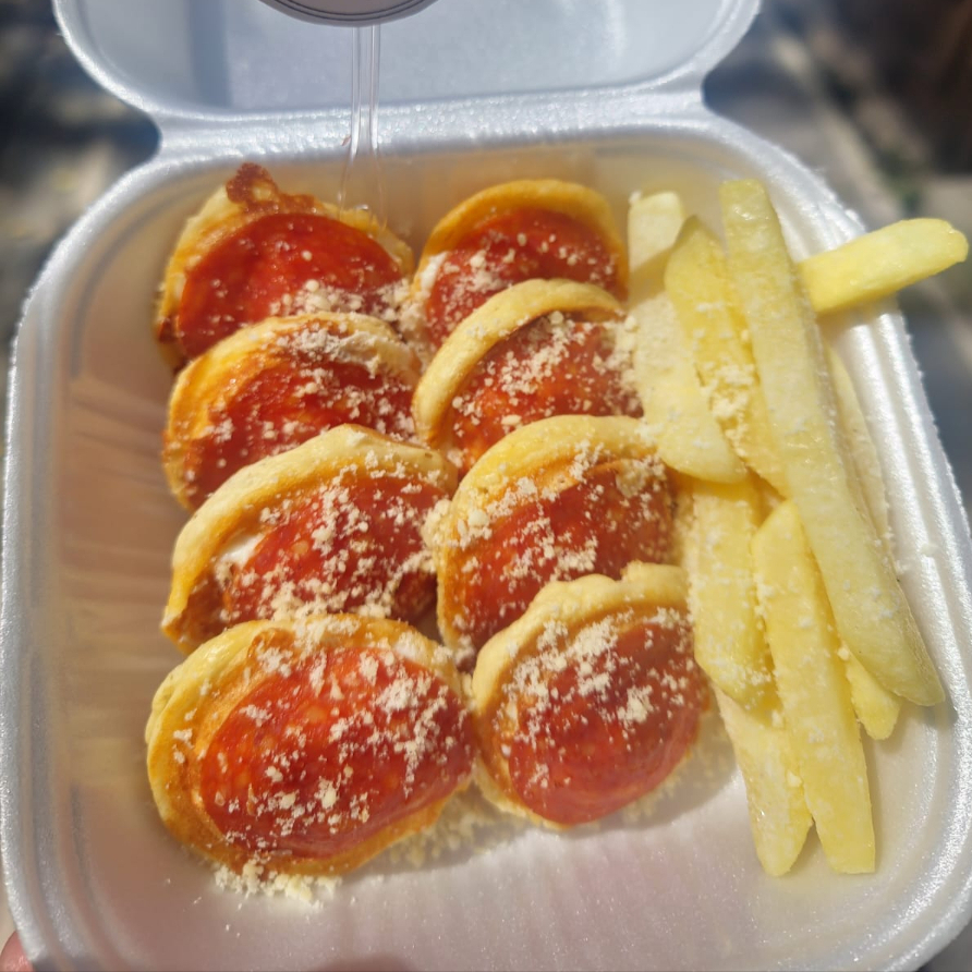10 minnis pizzitas rellenas de queso motzarella con peperoni papas a la fransesa y salsa de tomate