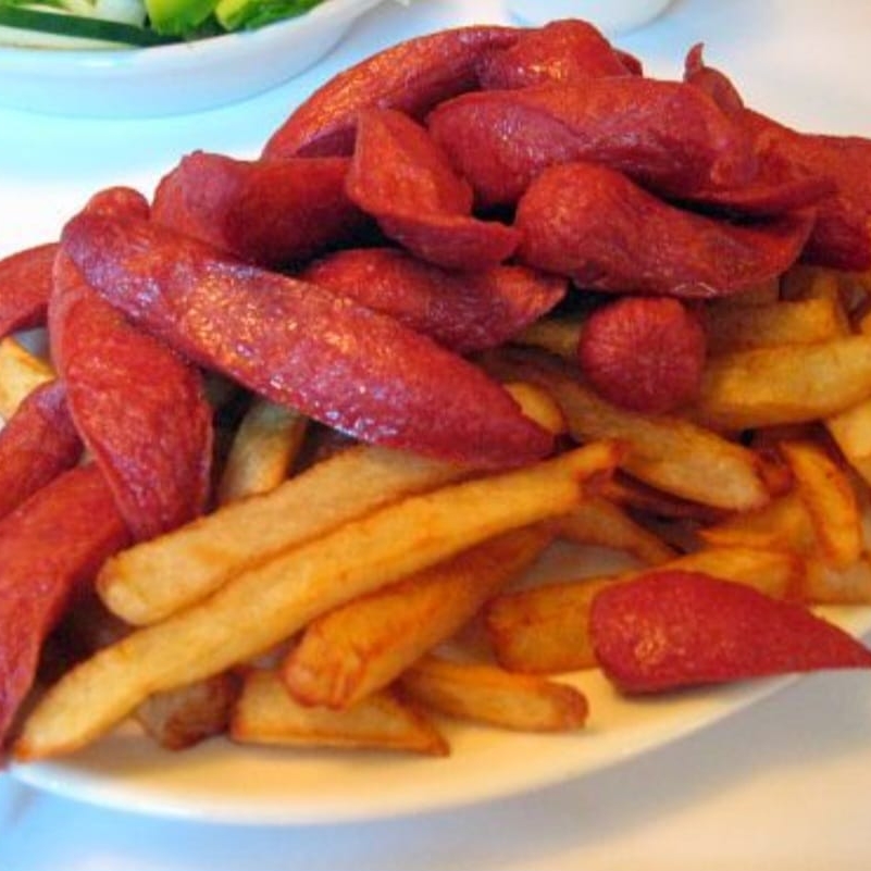 Carne de res salchicha para asar, jamon, queso amarillo, verduras y aderezos acompañada de papas a la francesa