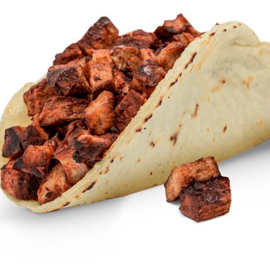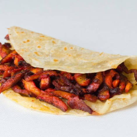TORTILLA DE HARINA MEDIANA, CARNE DE TROMPO Y BISTEC DE RES, VERDURAS Y SALSA
