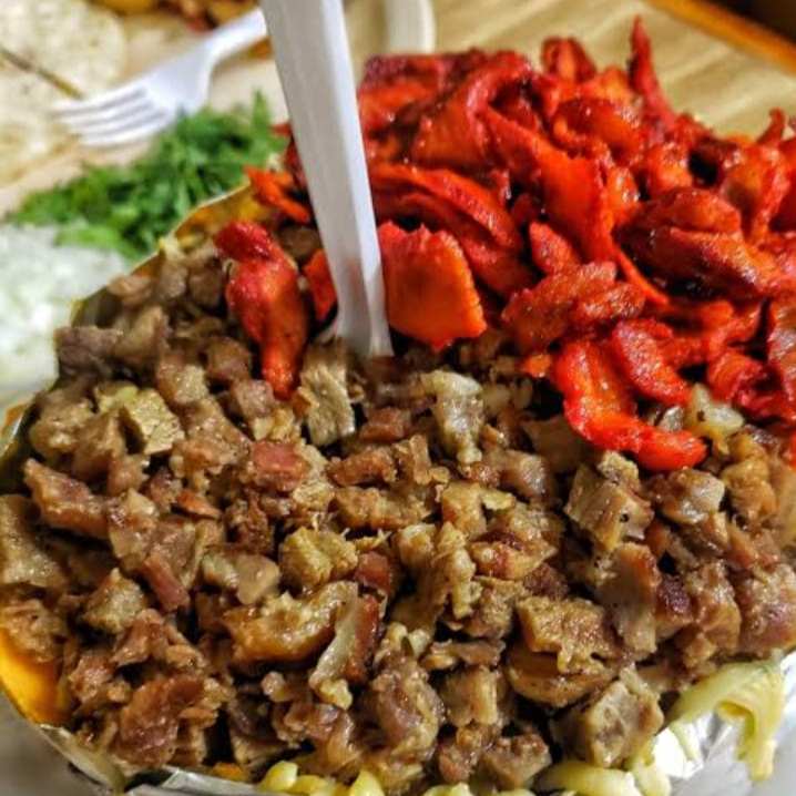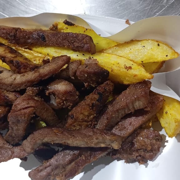 carne de res acompañada de papas , carne de trompo ,queso , jamon , lechuga y aderezos