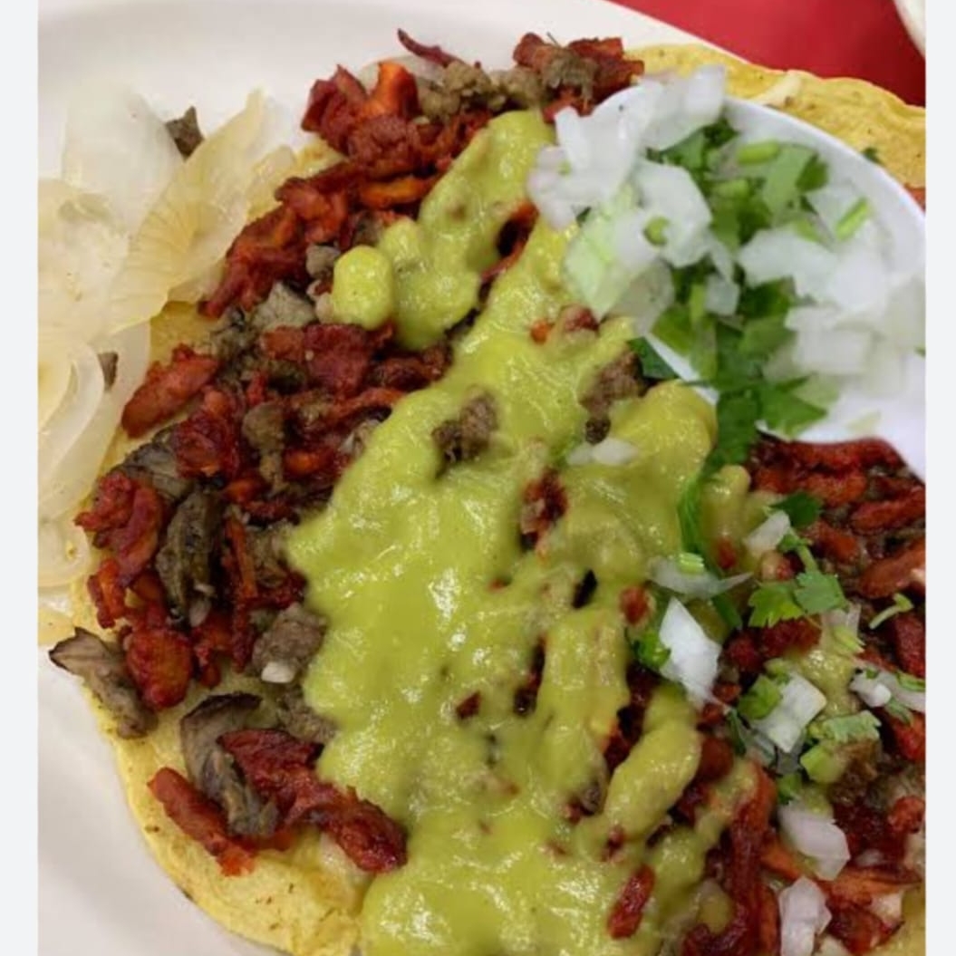 TORTILLA DE ARINA GRANDE CARNE DE BISTEC, CHORIZO , QUESO , AGUACATE , SALSA Y LIMONES