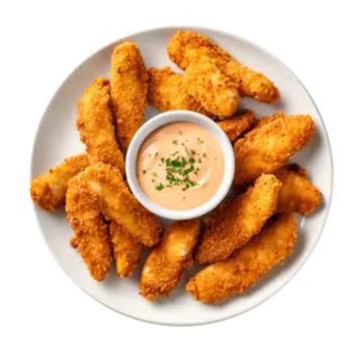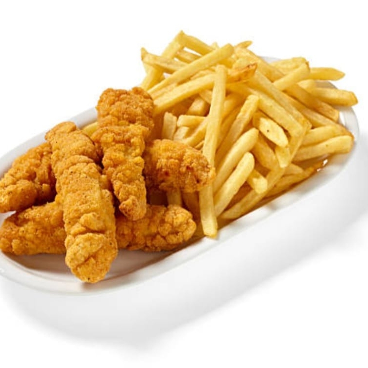 800 GMS DE TENDERS BAÑADOS EN TU SALSA FAVORITA ACOMPAÑADOS DE PAPAS A LA FRANCESA