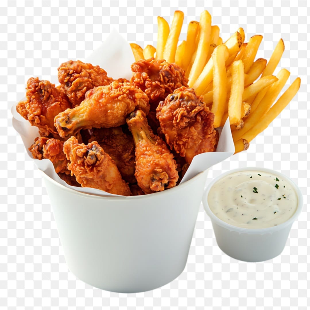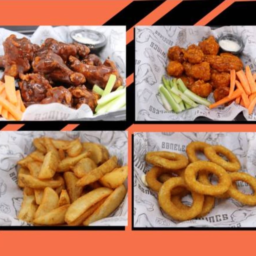 MEDIO KG DE BONELES Y MEDIO KG ALITAS BAÑADOS EN TU SALSA FAV ACOMPAÑADAS DE PAPAS A LA FRANCESA