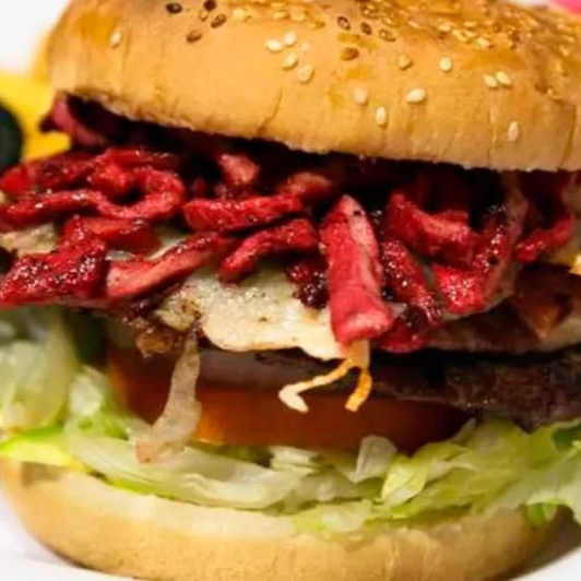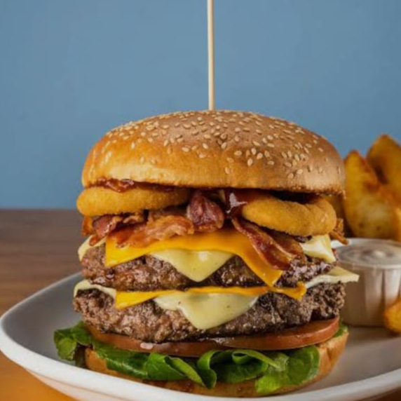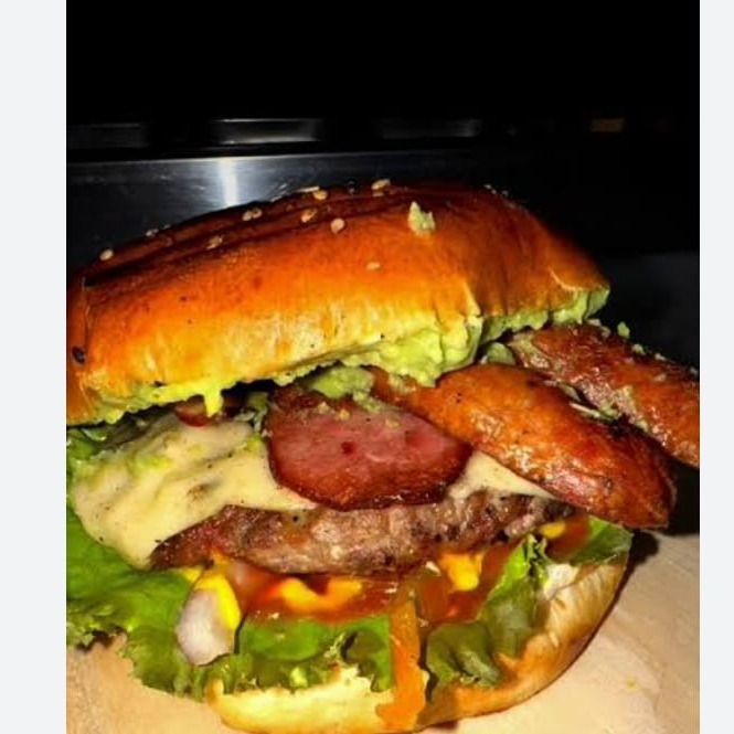 doble carne de res , doble jamon ,queso asadero , aguacate ,tocino ,2 aros de cebolla , lechuga y aderezos