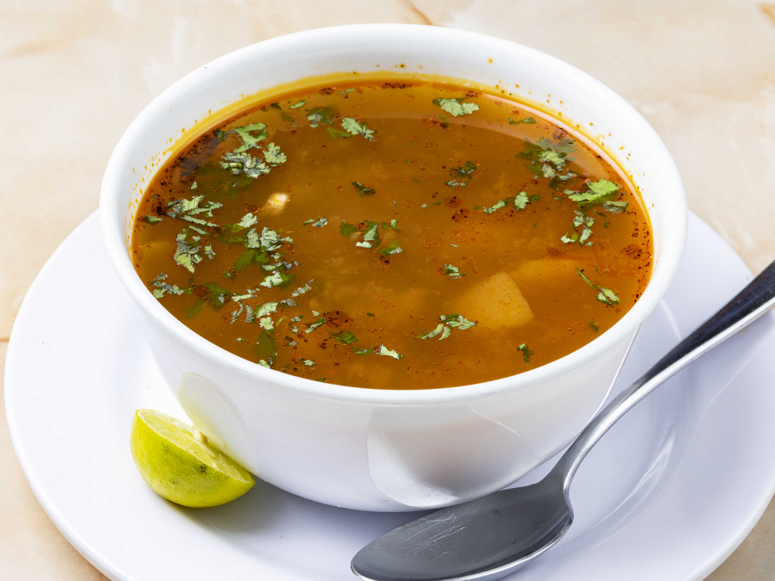 Caldo Grande de Pescado de 1 litro cebolla y cilantro dentro del caldo, salsa limon y 2 galletas