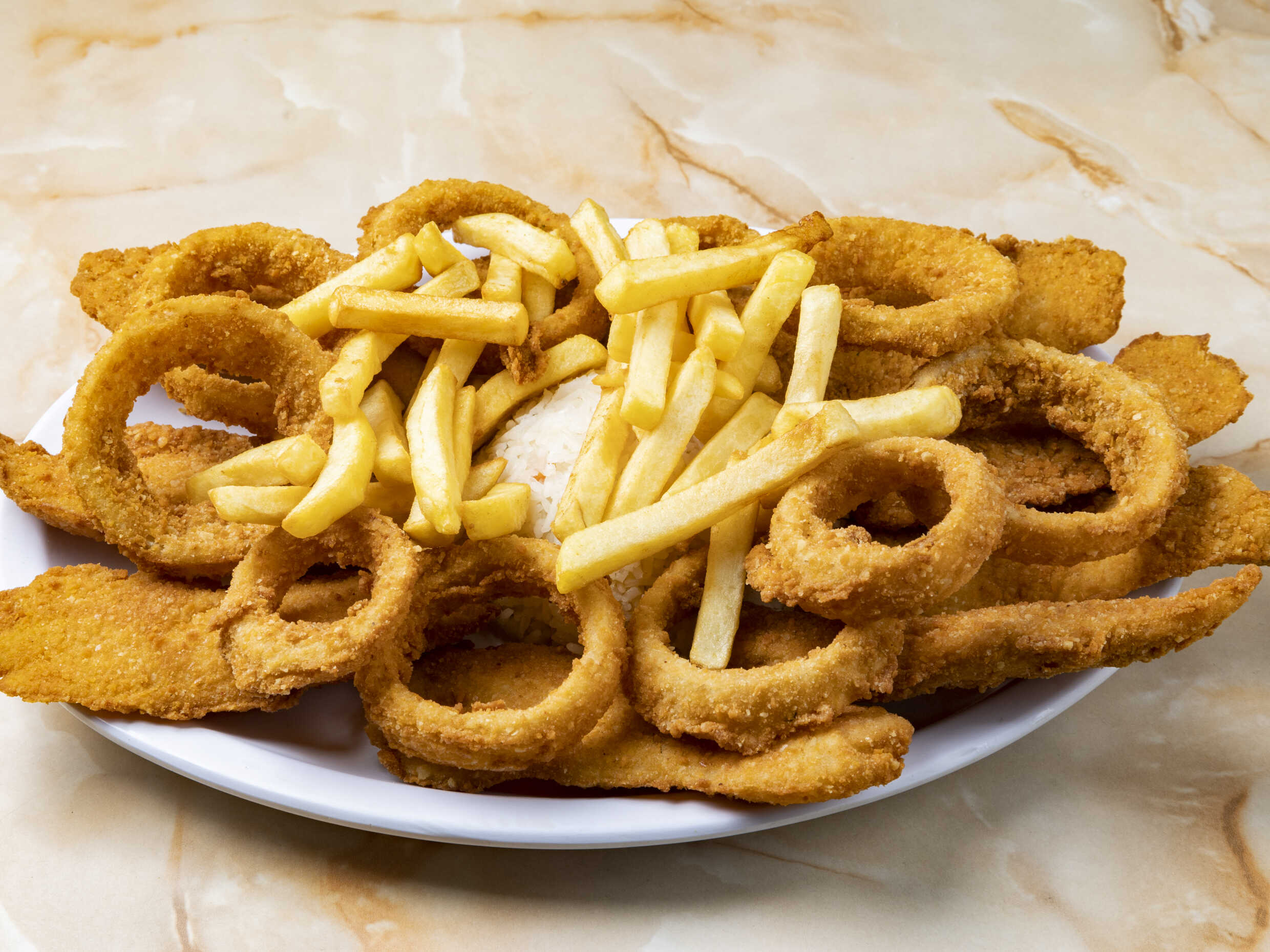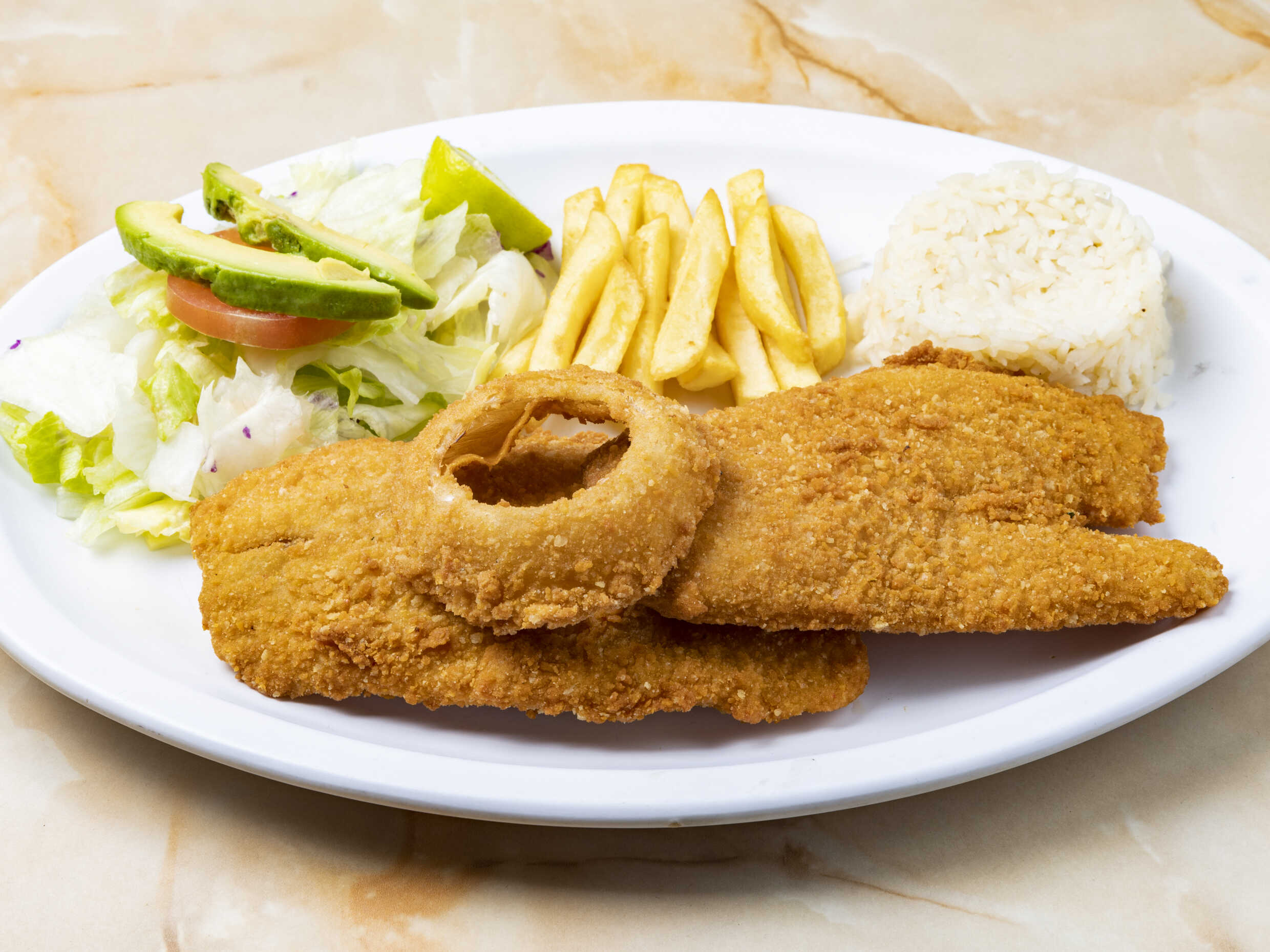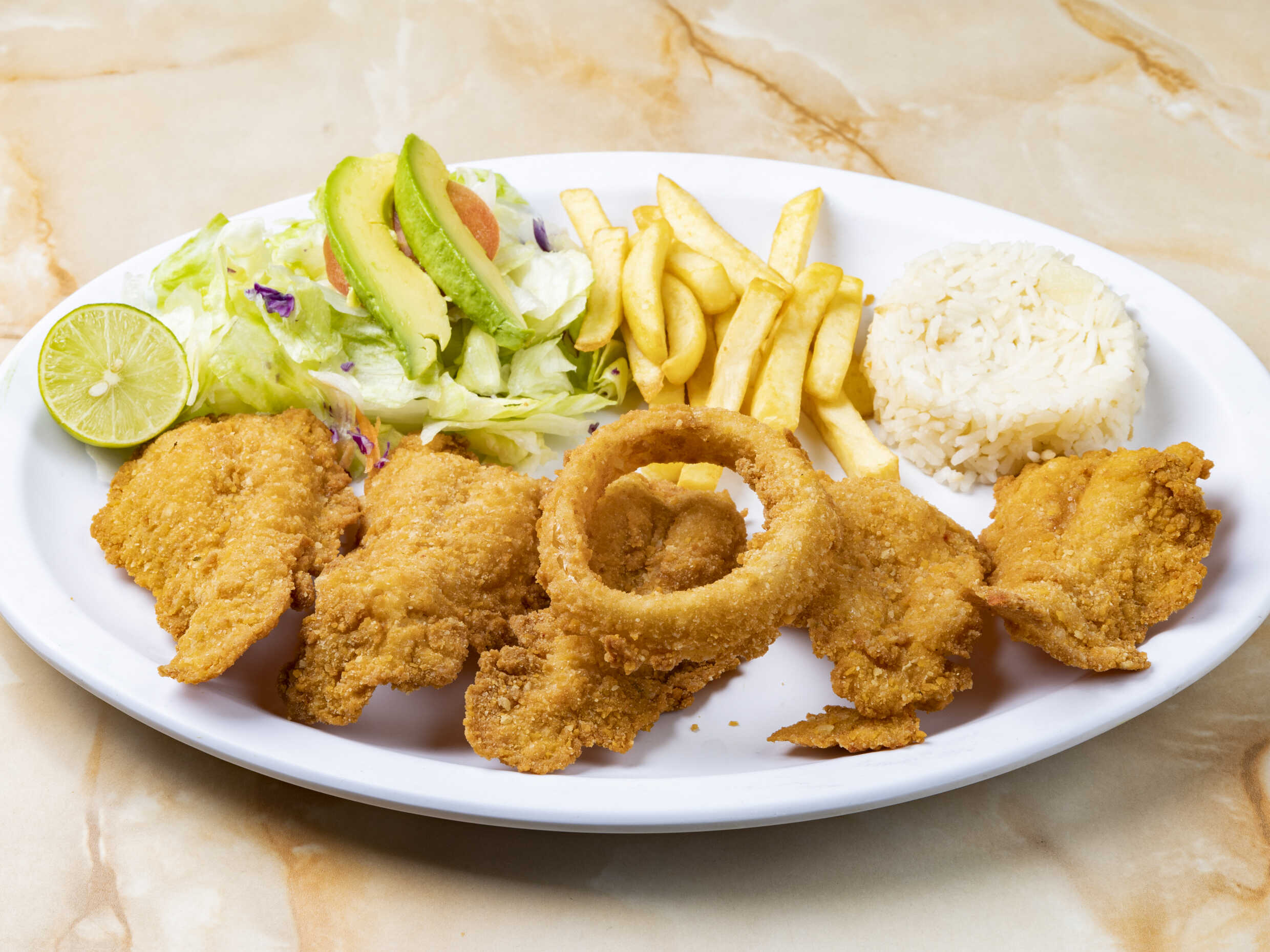 Medio kilo de filete empanizado, arroz, papas a la francesa y aros de cebolla.