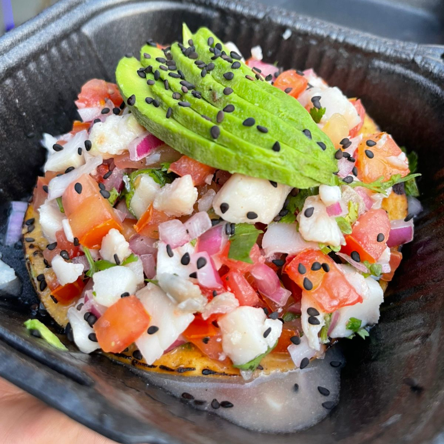 Ceviche de filete de pescado, tomate, cebolla morada, cilantro, limon y aguacate