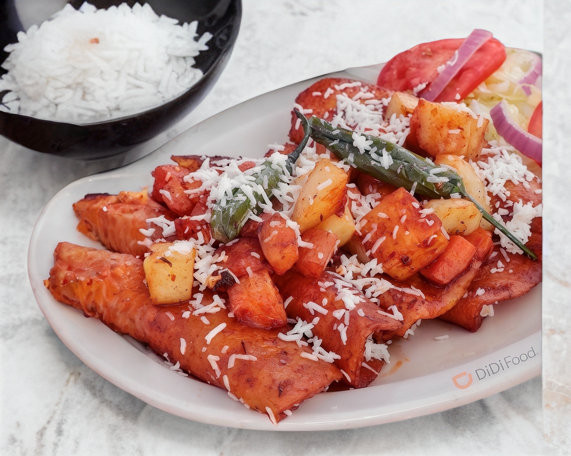 Tortillas bañadas en salsa roja con queso acompañada de papa, zanahoria, chile toreado con queso encima, lechuga, tomate y cebolla y sin cebolla . Guarnición: arroz ó frijol.