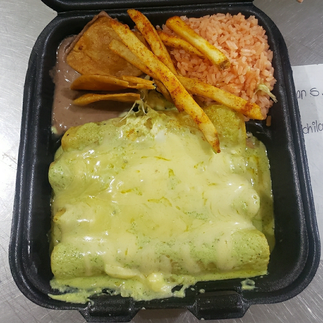 4 Tacos suaves de pollo bañados con salsa verde cremosa , queso gratinado ,acompañadas de Arroz ,frijoles y papitas