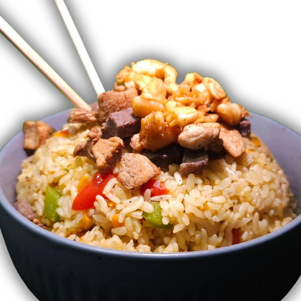 Delicioso arroz frito preparado al momento, con verduras salteadas en mantequilla y acompañado de Res, Pollo y Camarón Se sirven con soya y chipotle aparte.