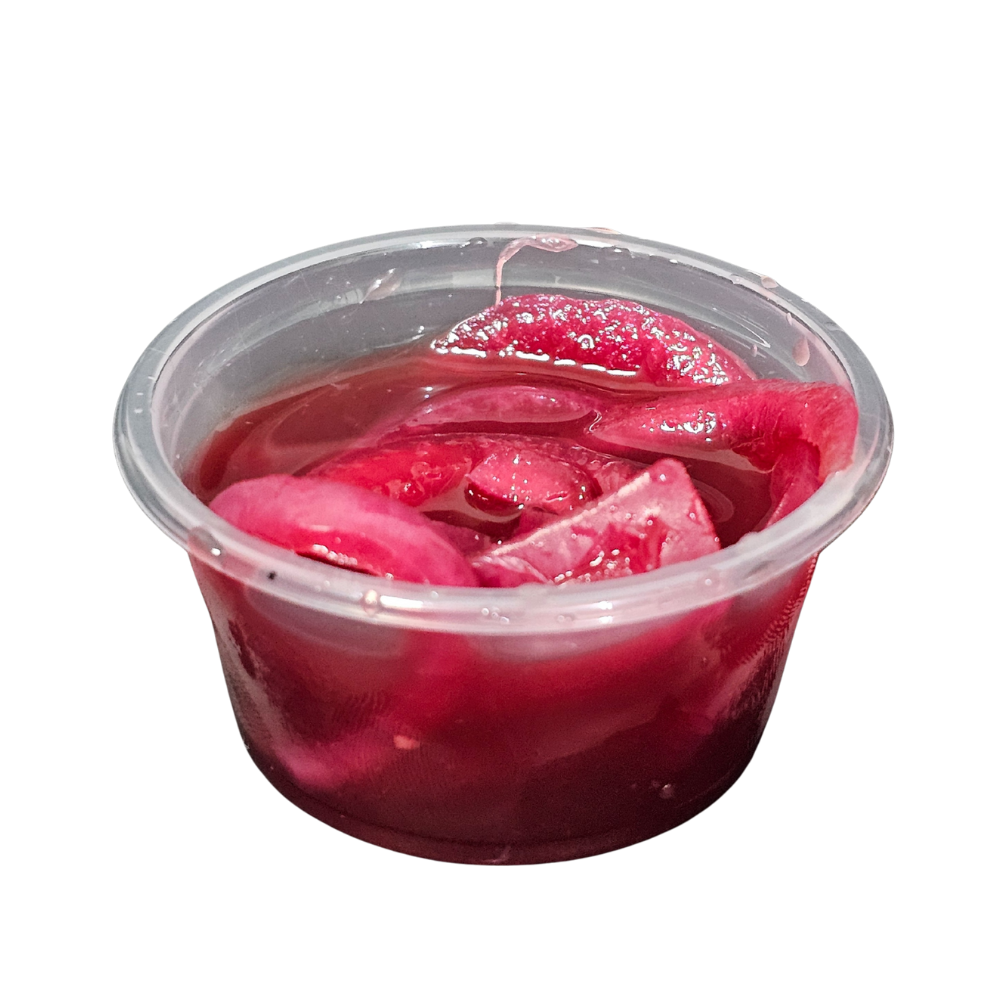 Cebolla encurtida con notas ácidas y saladas. Porciones individuales ideales para acompañar y realzar el sabor de tus platillos.