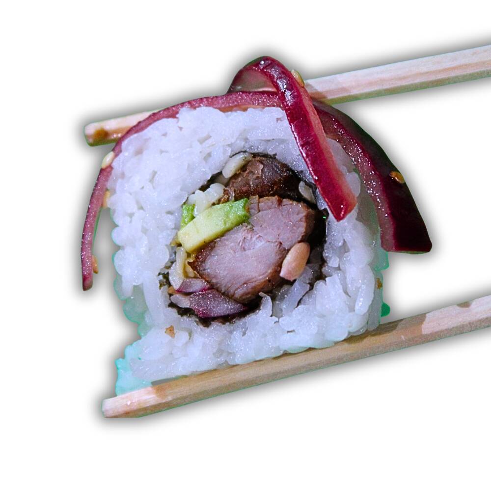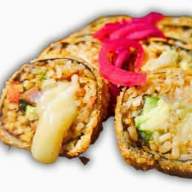 Alga por fuera Por dentro: arroz frito, camarón y res, aguacate y manchego. Por fuera: Pollo agridulce o natural y chipotle.