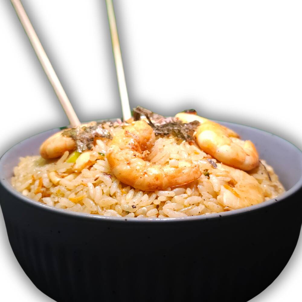 Delicioso arroz frito preparado al momento, con verduras salteadas en mantequilla y acompañado de Camarón. Se sirven con soya y chipotle aparte.