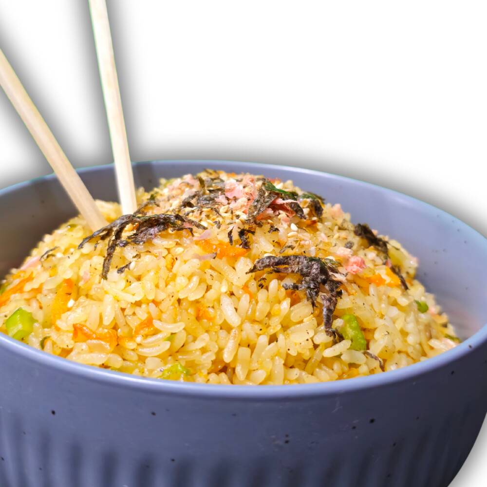 Arroz cocido tradicional acompañado de Tampico y ajonjolí. Se sirve con soya y chipotle aparte.