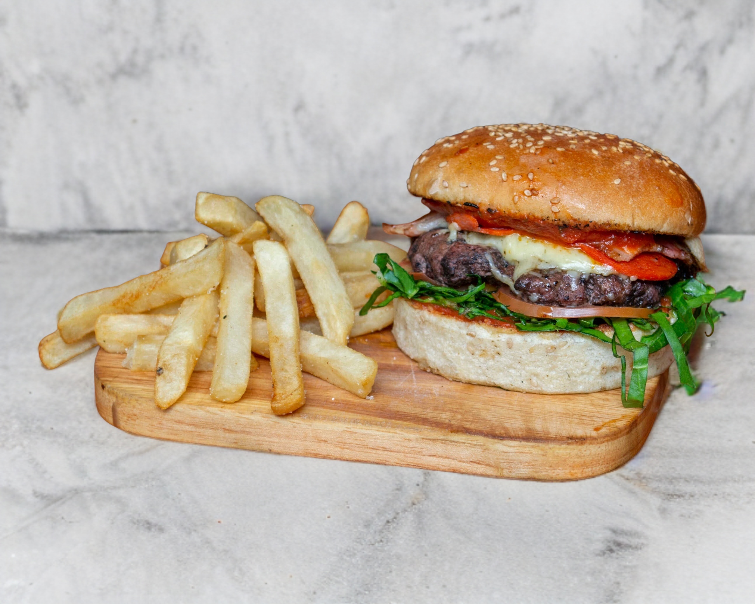 Hamburguesa pizzera al carbón, carne marinada con receta de la casa, con aderezo de tomate, acelga, tomate, queso gouda y cheddar gratinado con peperoni y tocino.