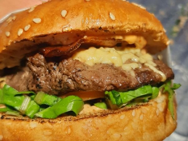Deliciosa hamburguesa, carne de res 150 gr, queso chihuahua, cebolla asada, tocino, acelga, tomate y BBQ.