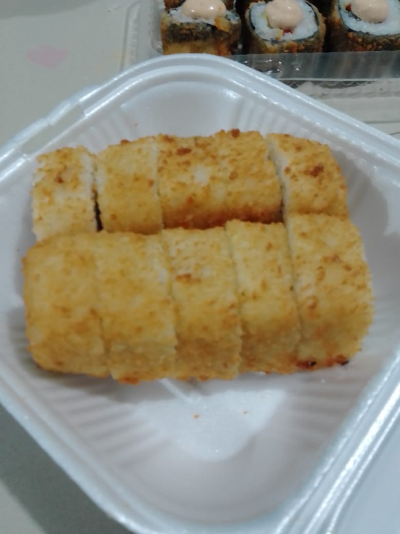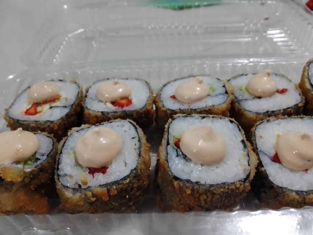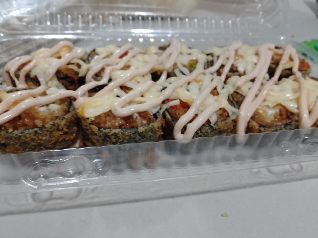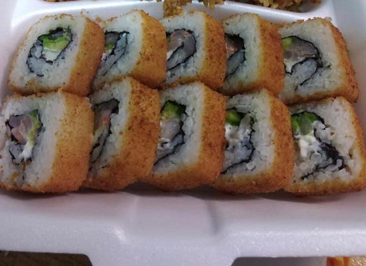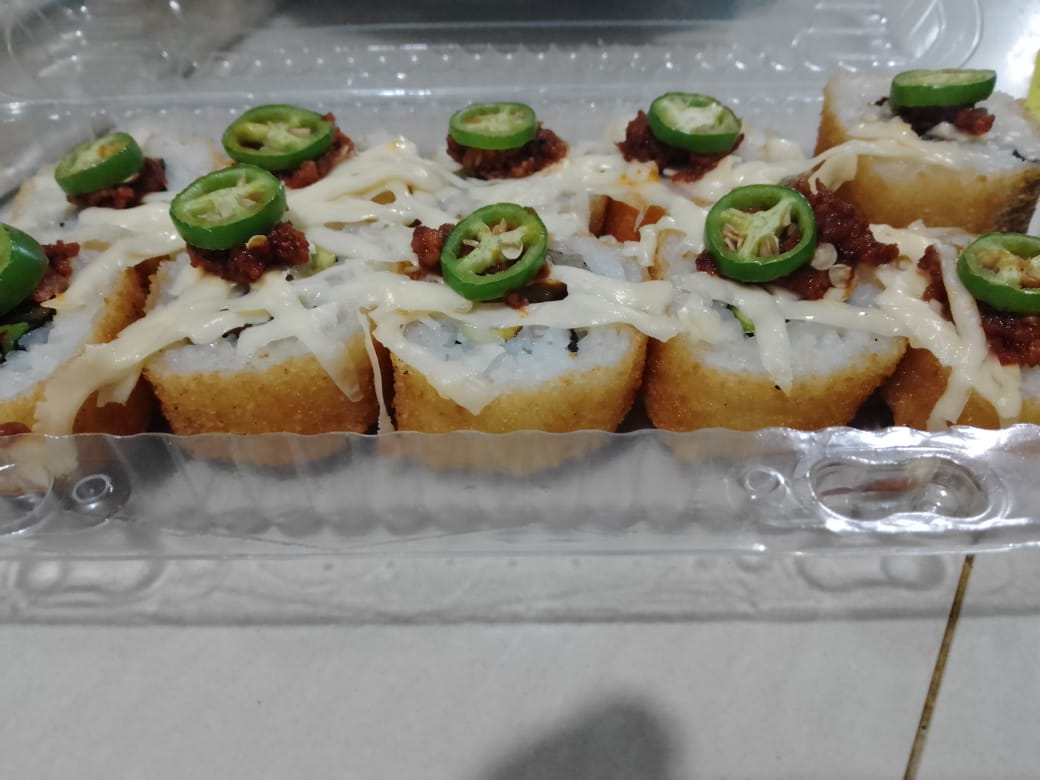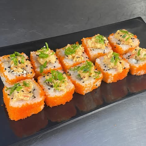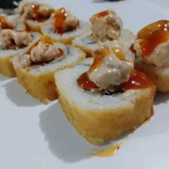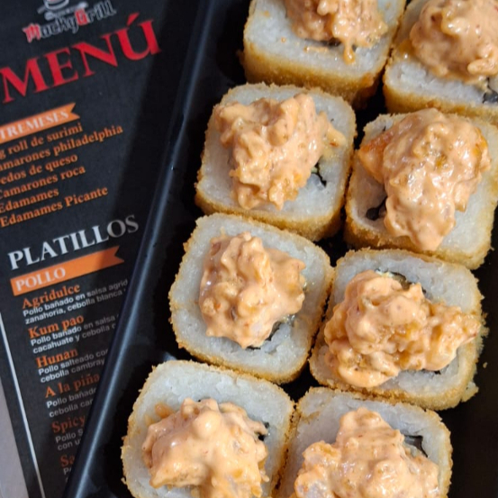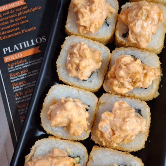 camaron tempura,arroz frito,queso crema,aguacate por dentro ,gratinado por fuera y aderezo chipotle
