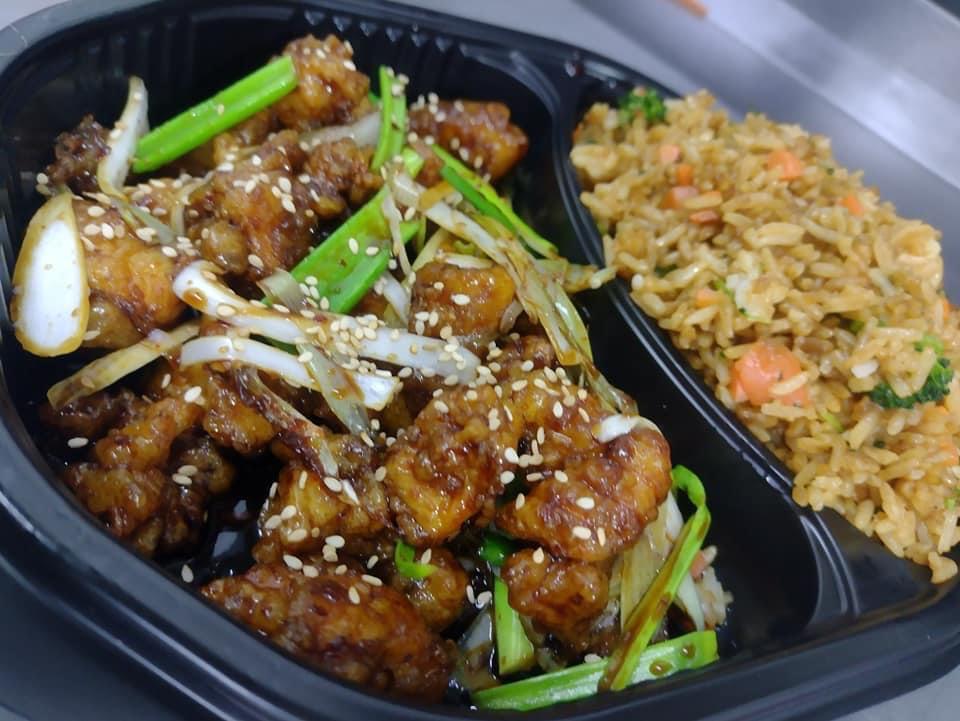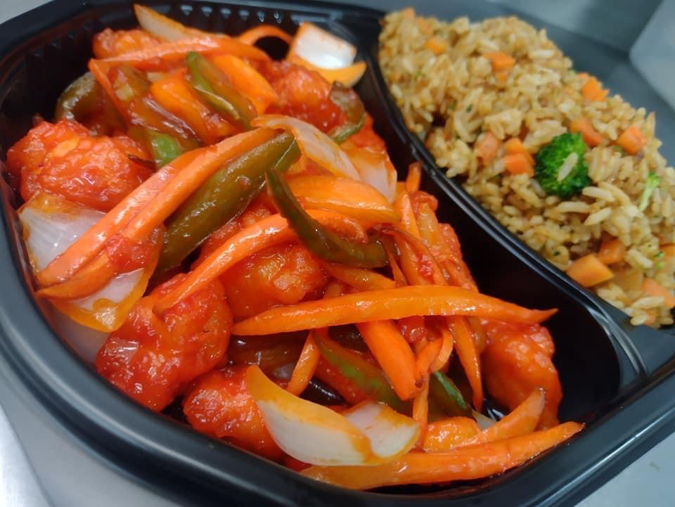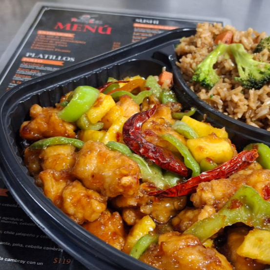 platillo de Pollo bañado en salsa agridulce con morrón, zanahoria, cebolla blanca, piña acompañado con guarnición de arroz frito.