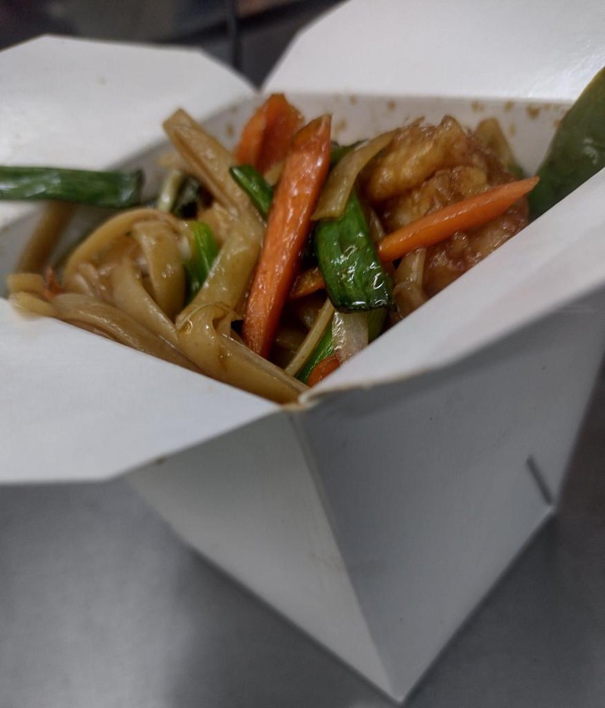 Tallarin bañados en salsa dulce a base de chiles acompañados con pollo, morrón, zanahoria, apio, cebolla cambray.